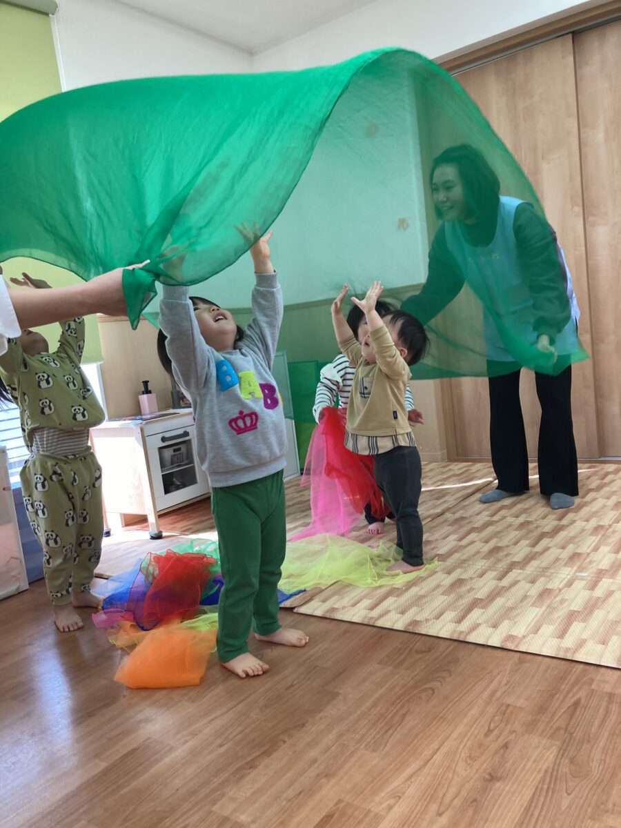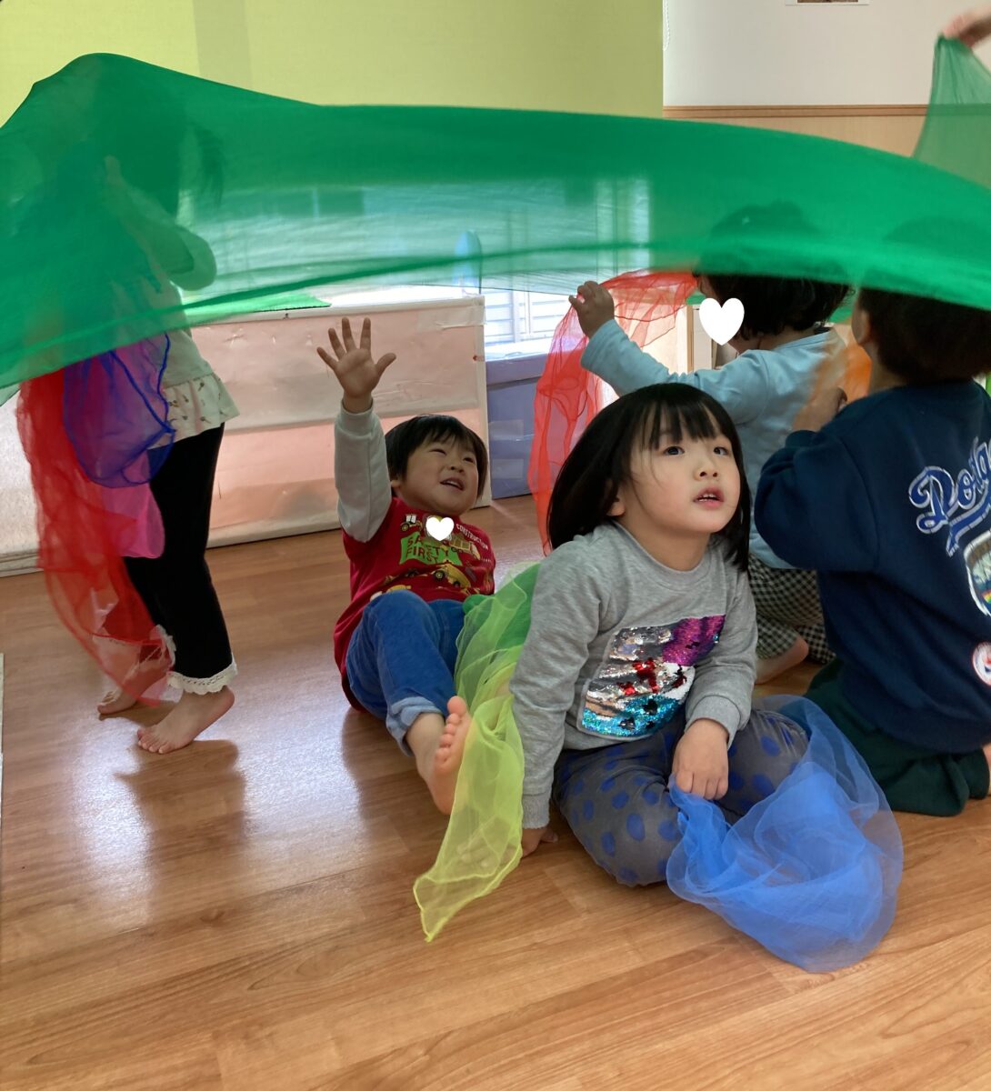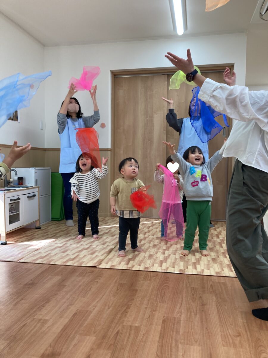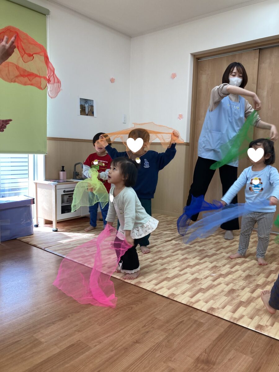「♪おはながわらった」に合わせてスカーフでお花を咲かせました![]()