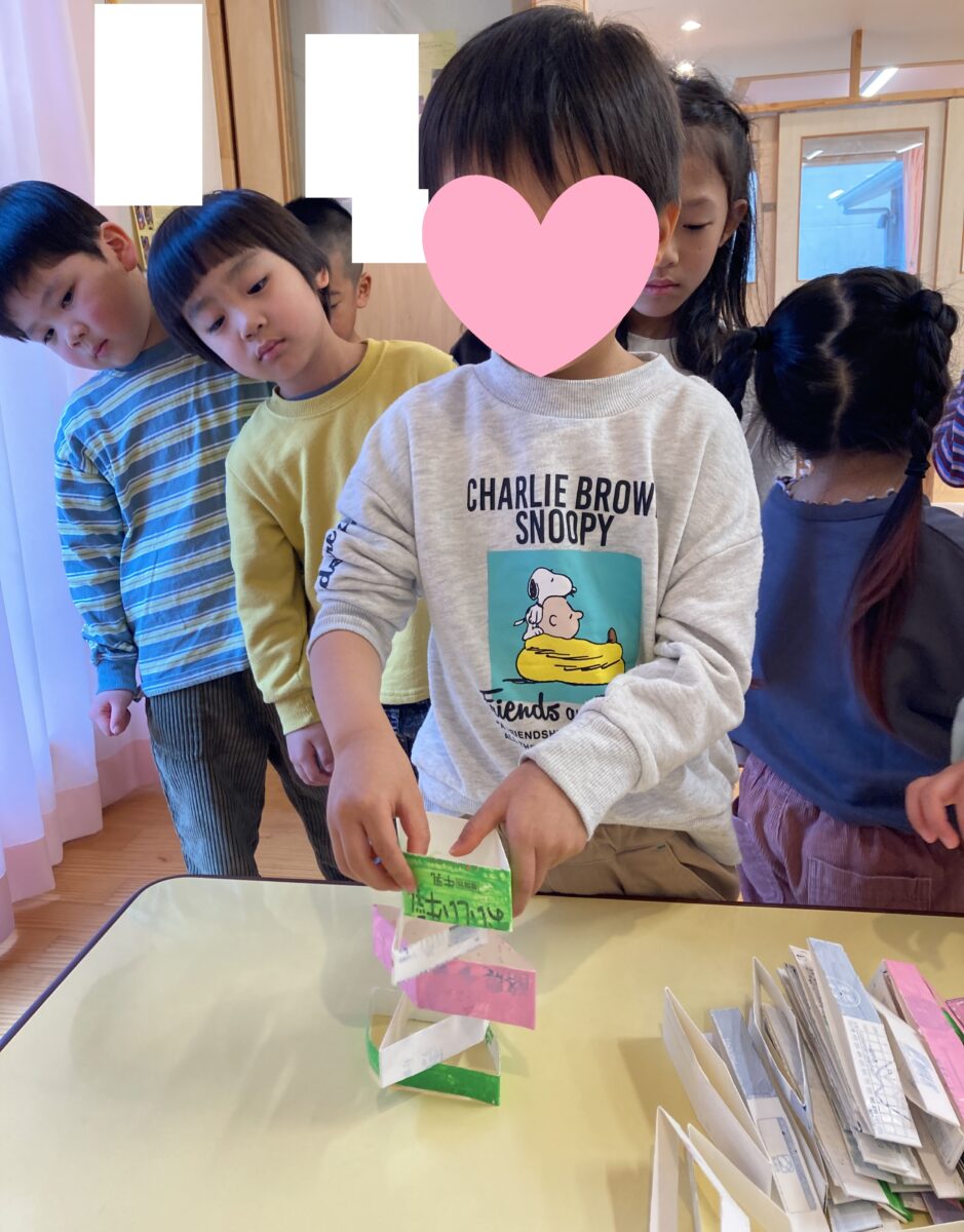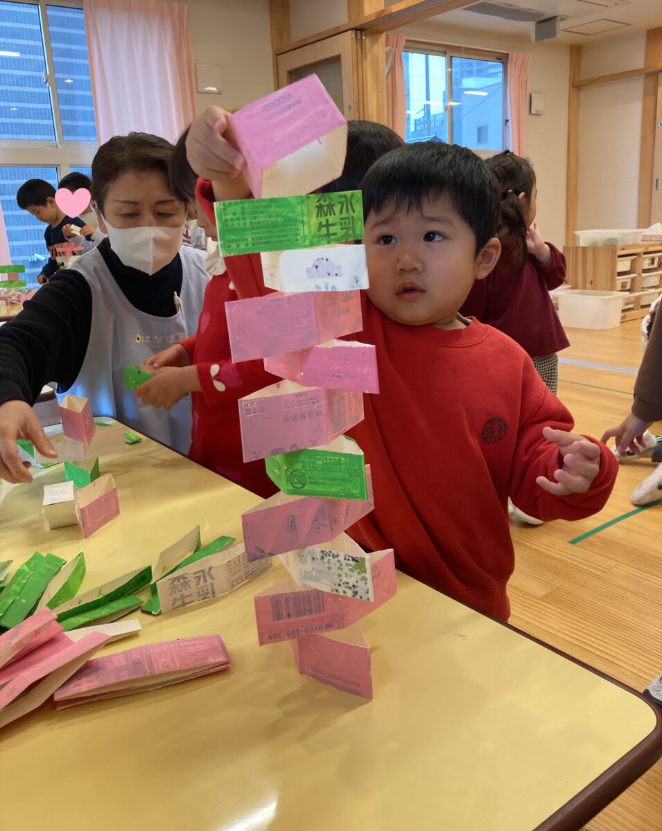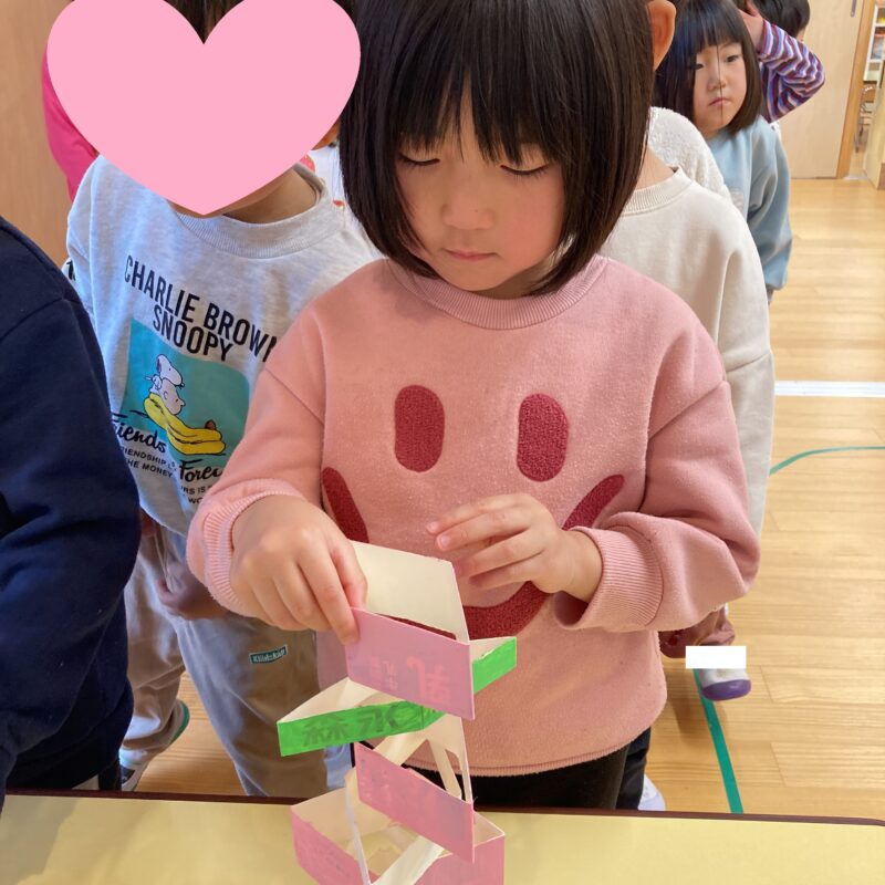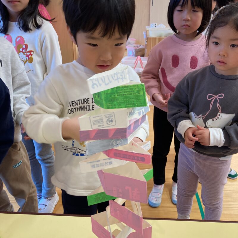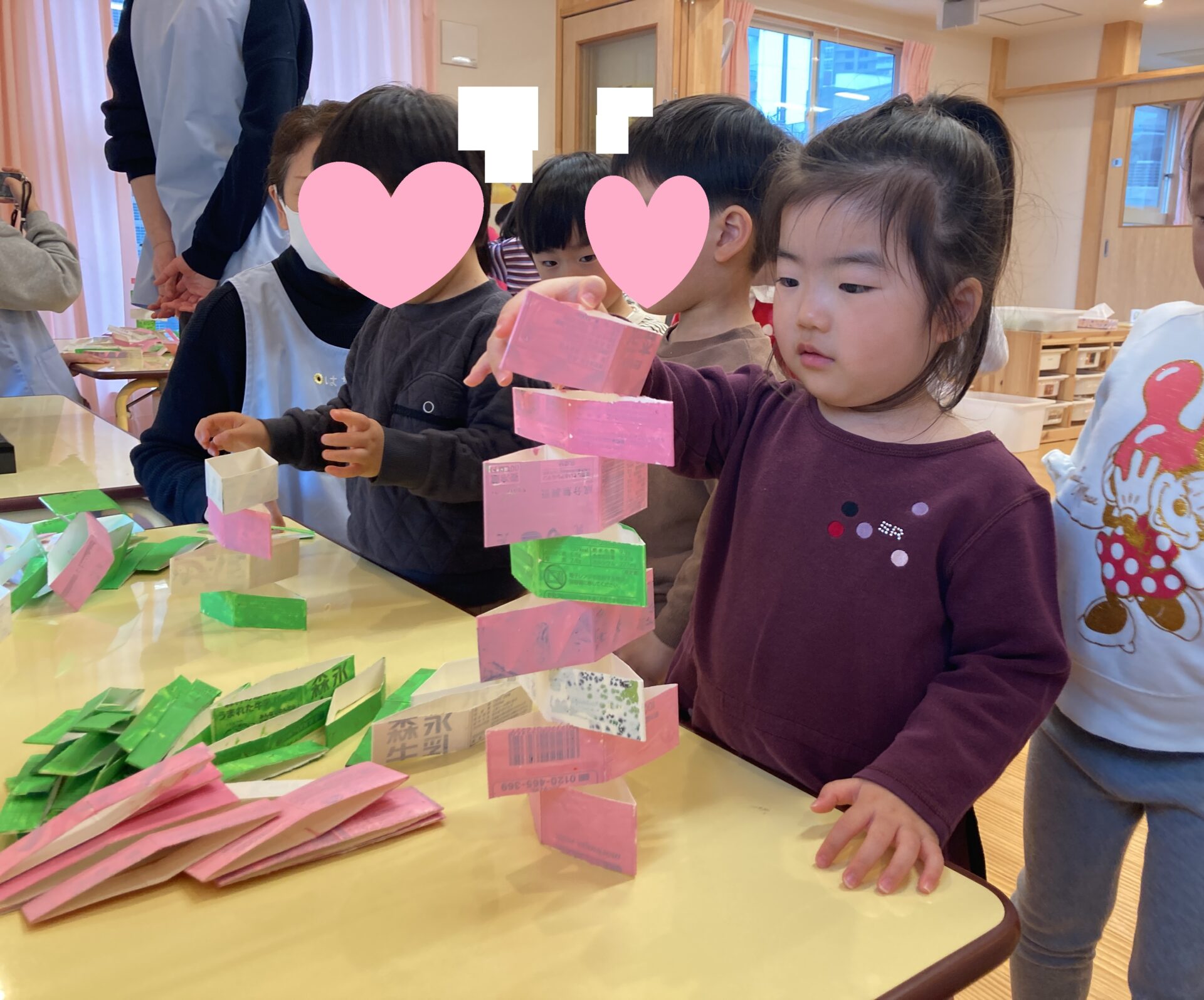 ひな祭り会の出し物では、ピンク・白・緑の牛乳パックを菱餅に見立てた菱餅積み上げゲームに挑戦しました![]()