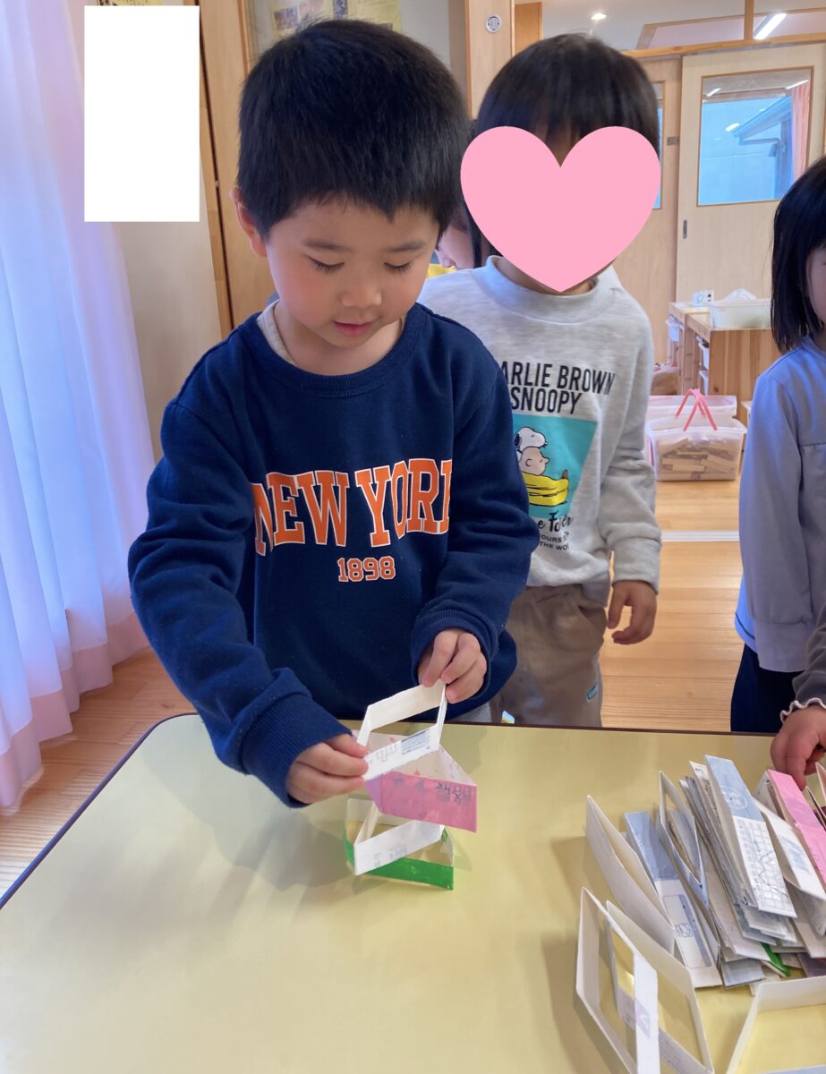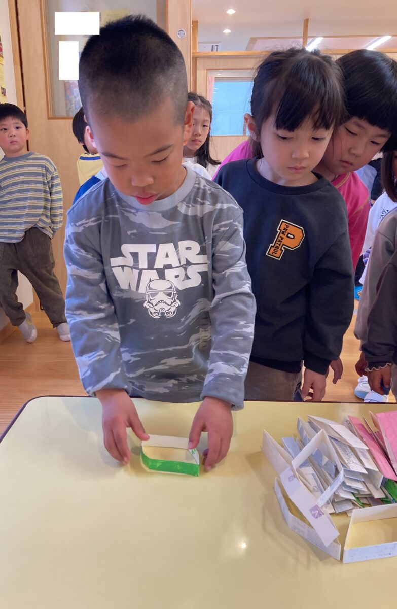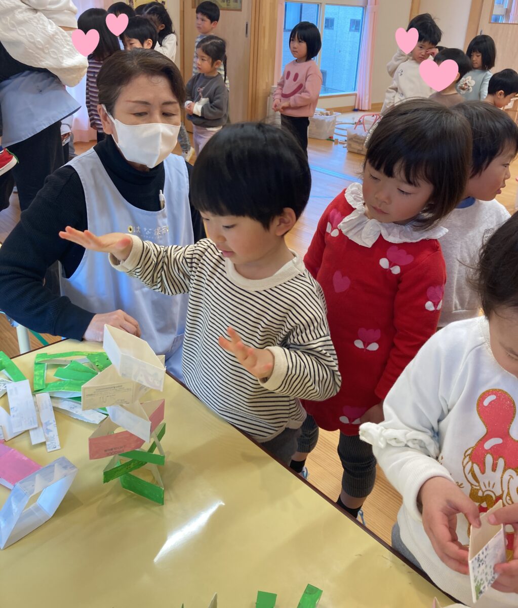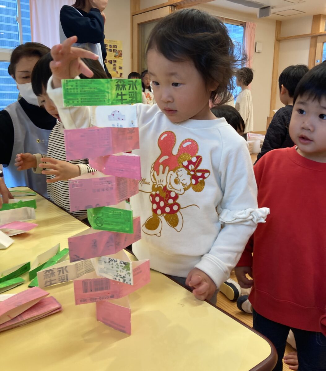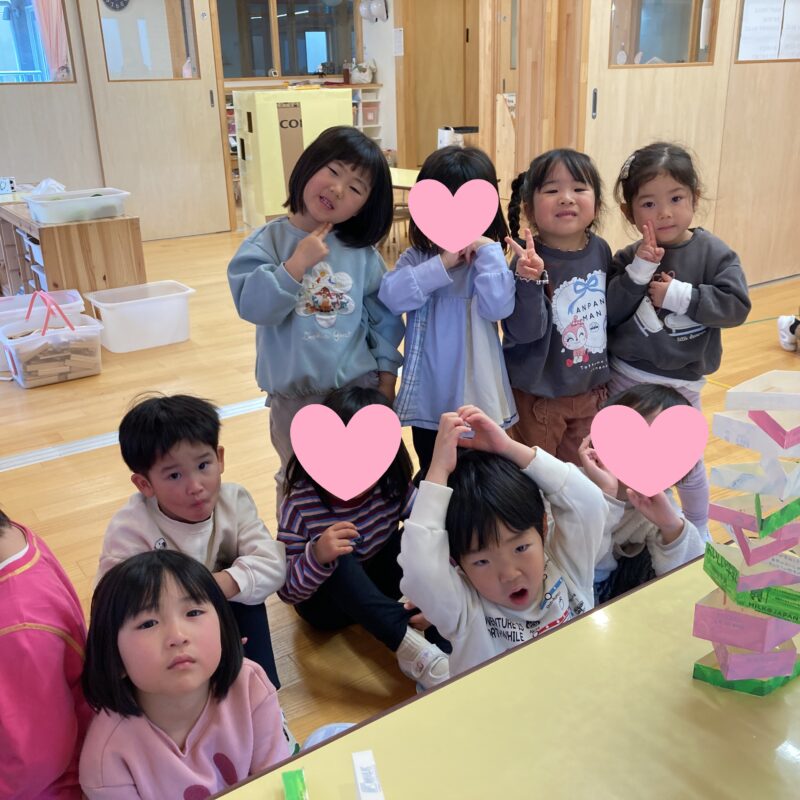 ひな祭り会の出し物では、ピンク・白・緑の牛乳パックを菱餅に見立てた菱餅積み上げゲームに挑戦しました![]()