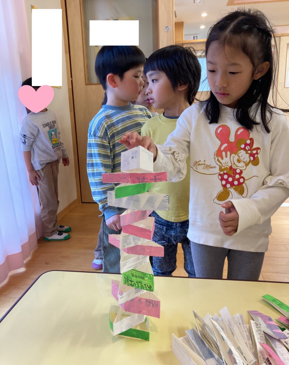 最後の最後に崩れてしまいましたが何度も挑戦した子どもたちの表情は達成感いっぱいの笑顔でした!!