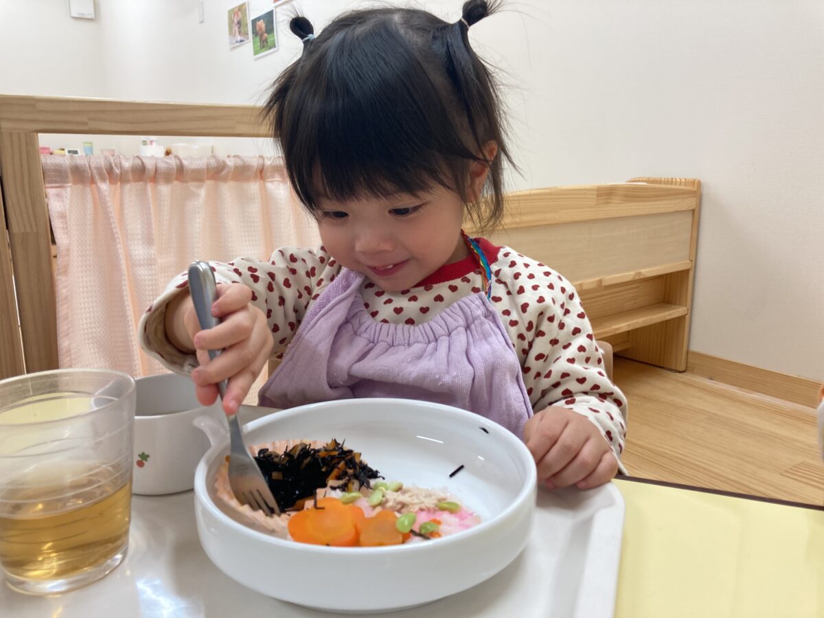いつもより少し豪華なメニューに思わず笑みがこぼれる子どもたちです![]()