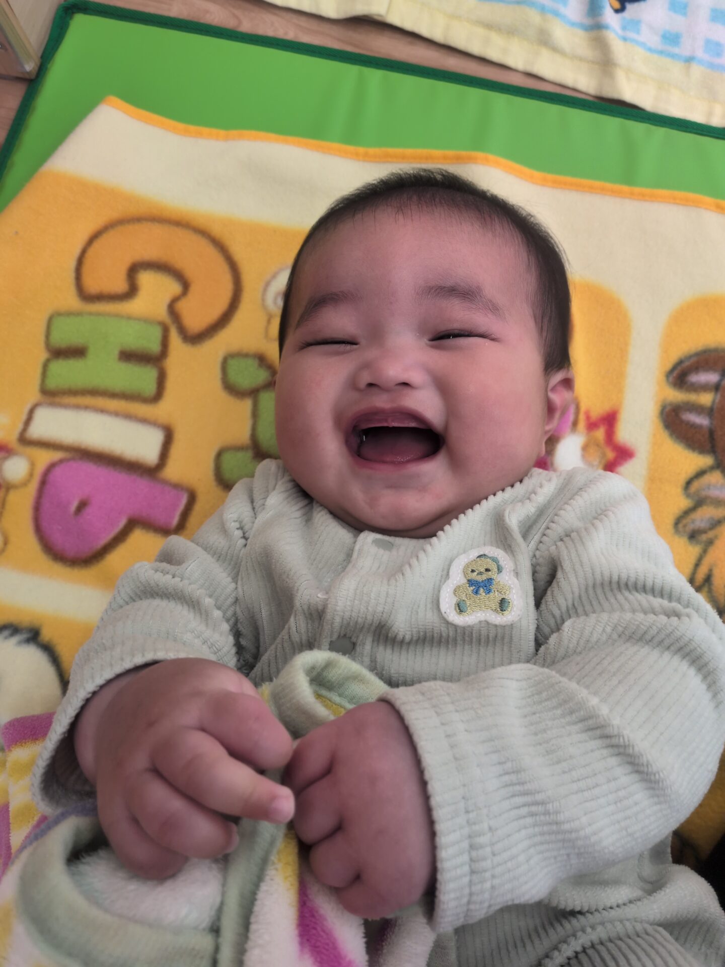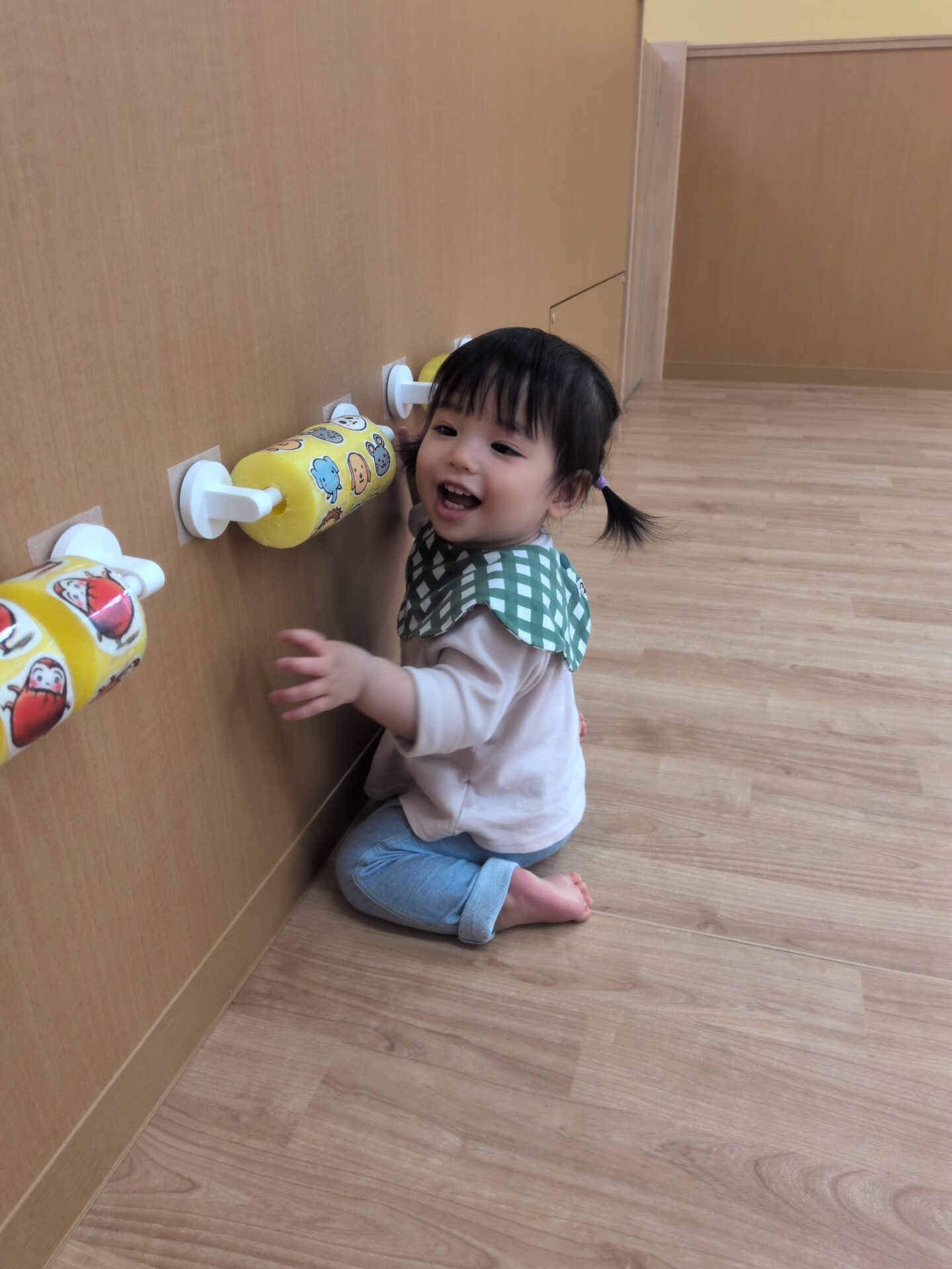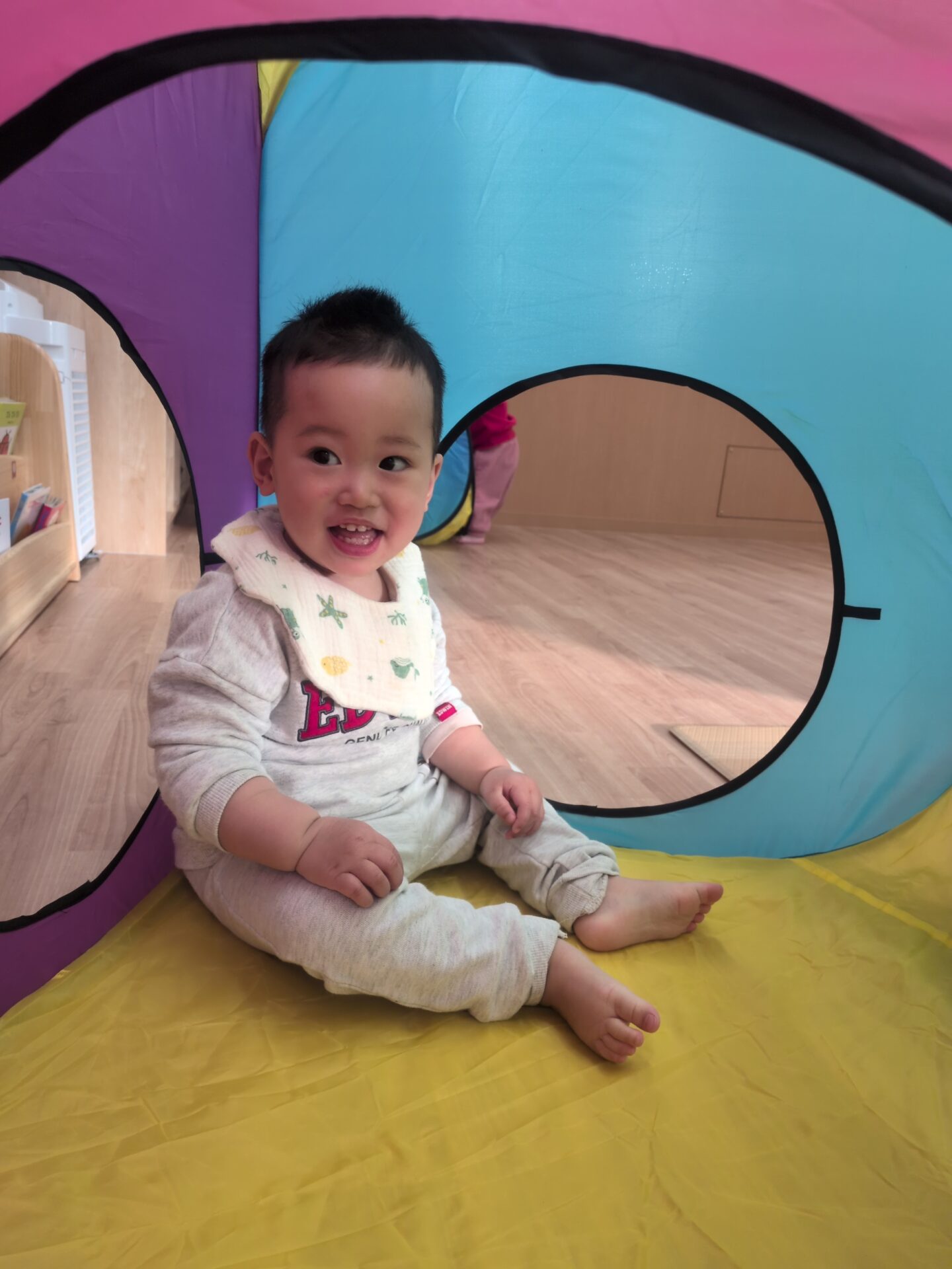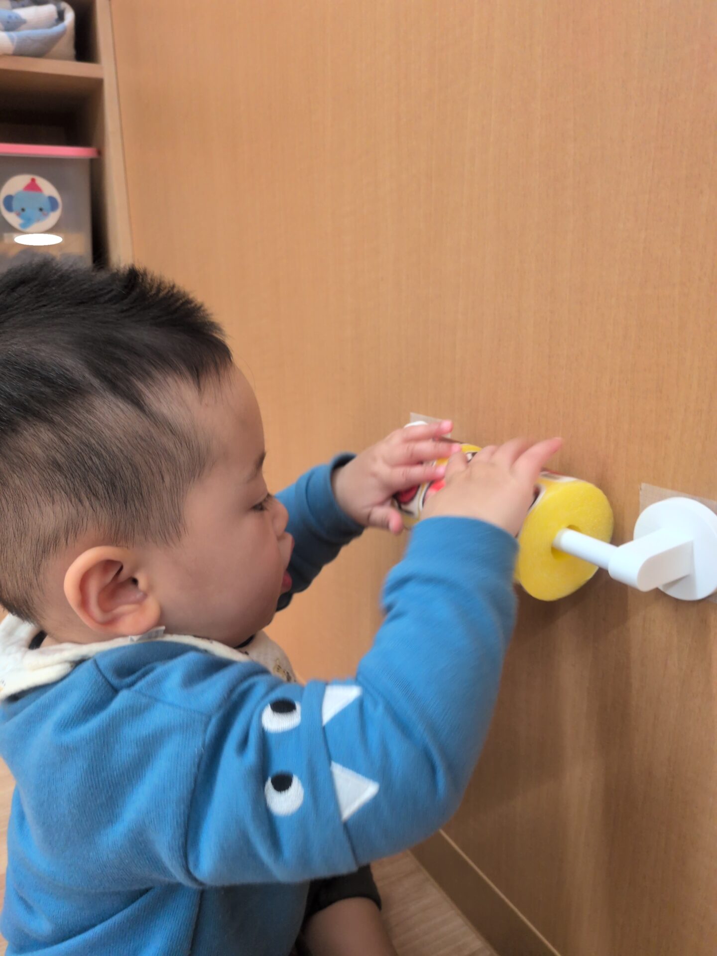 そろそろ、お昼寝の時間かな?のタイミングで保育者といないいないばあっ!を楽しんでいたお友達です