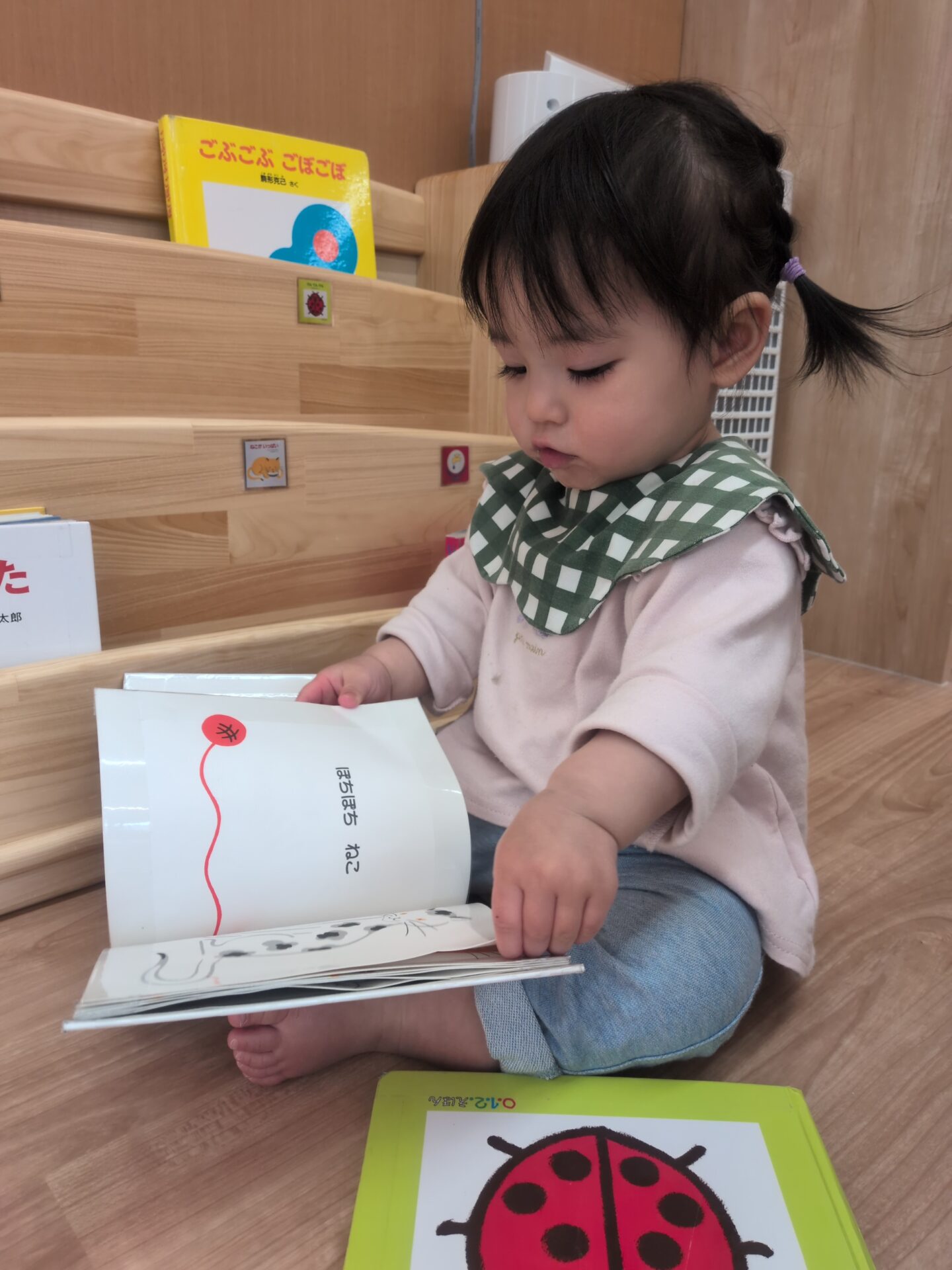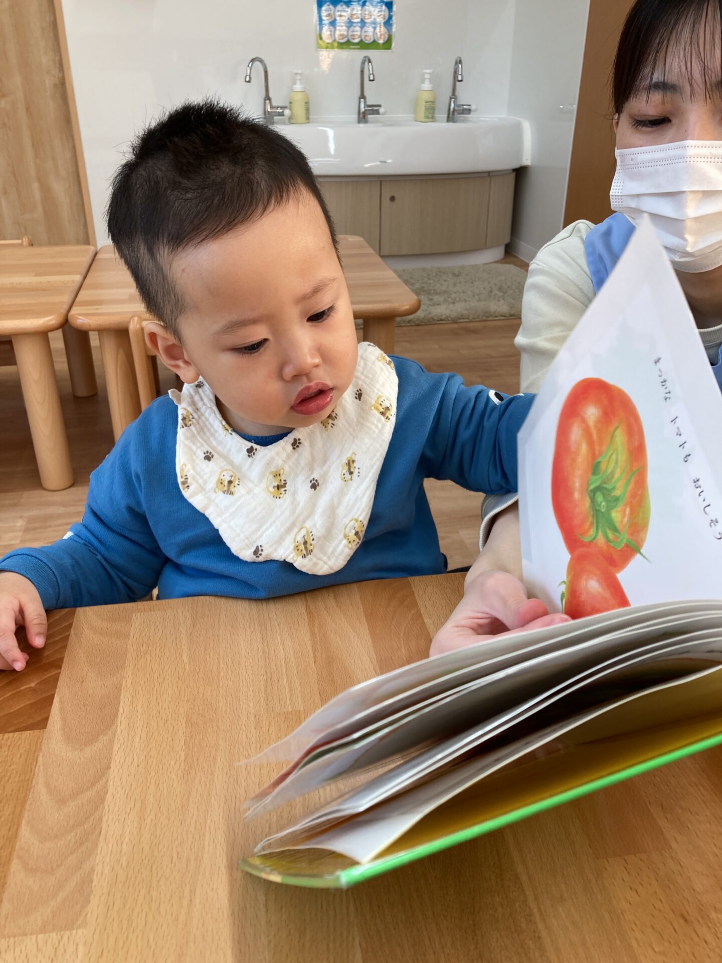 さくら組のお友達は絵本にも興味を示してくれるようになり、保育者とだけではなく一人で見ていることもありますよ