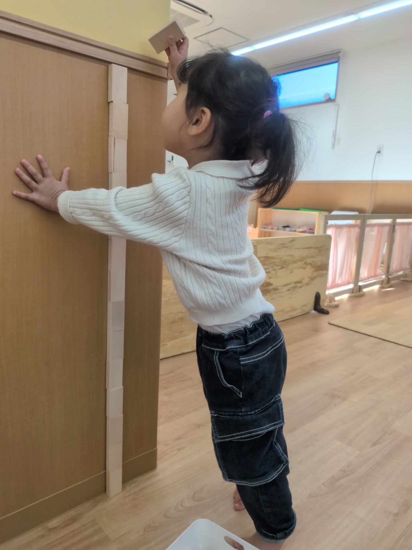 壁を使用して高く積み木を積み上げているお友達も