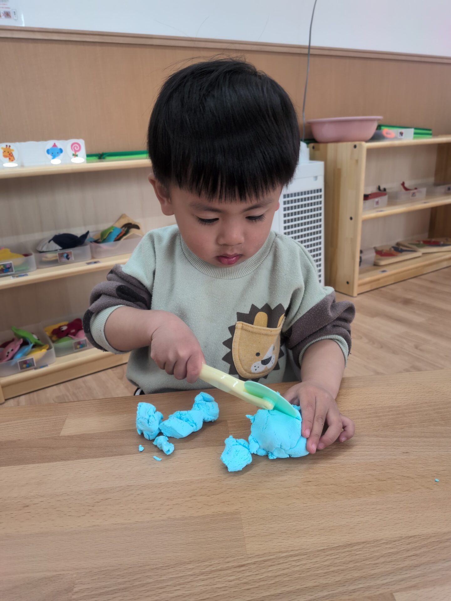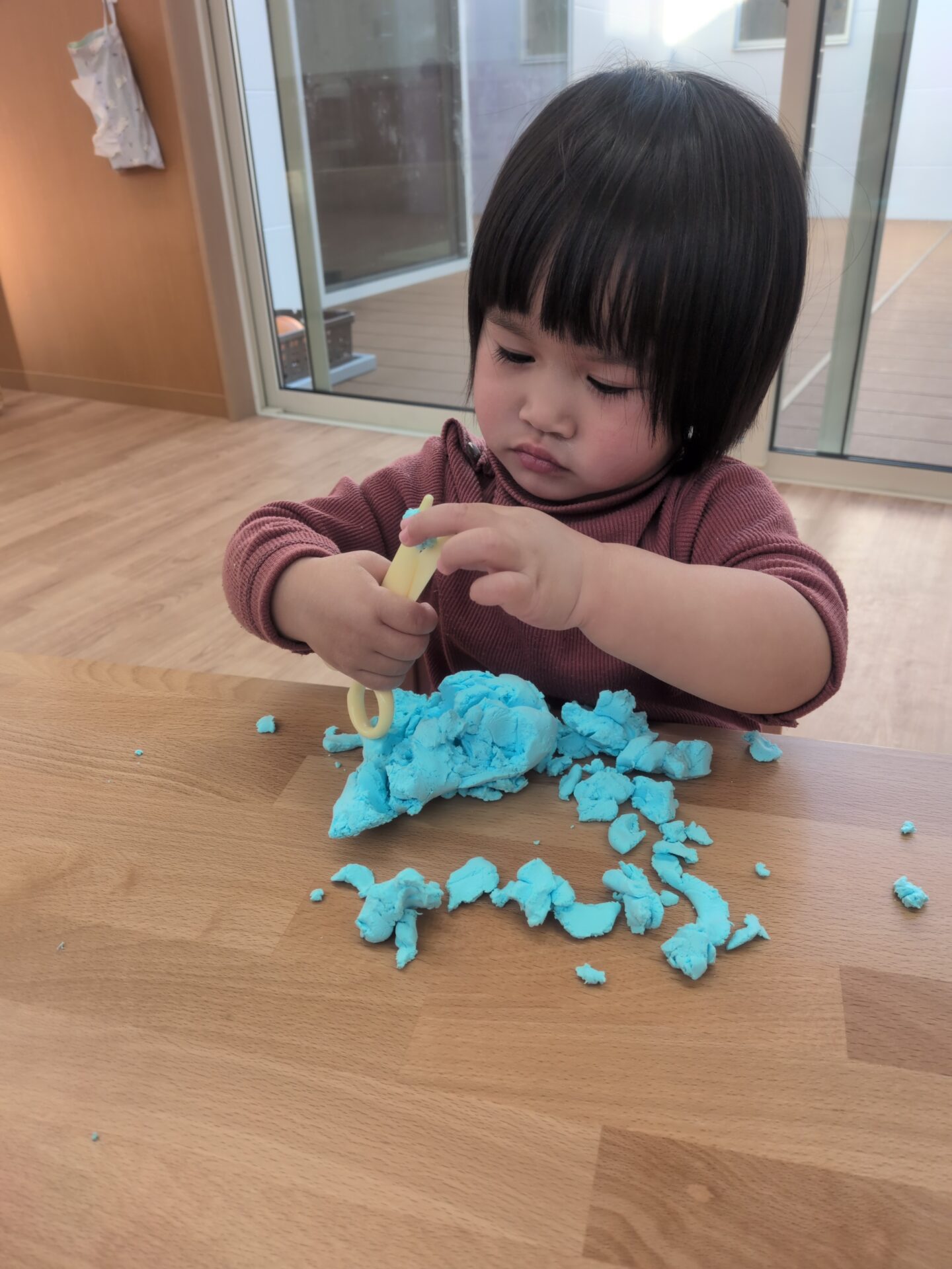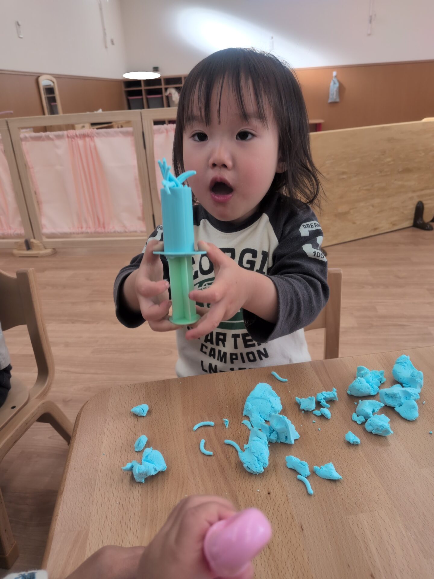 捏ねてみたり、粘土用の玩具を使用して遊んでみたりと夢中になって楽しんでいました