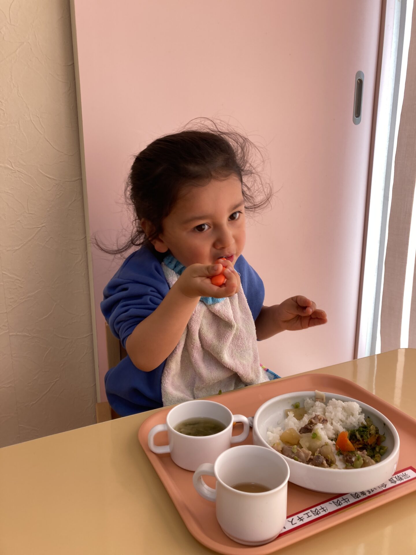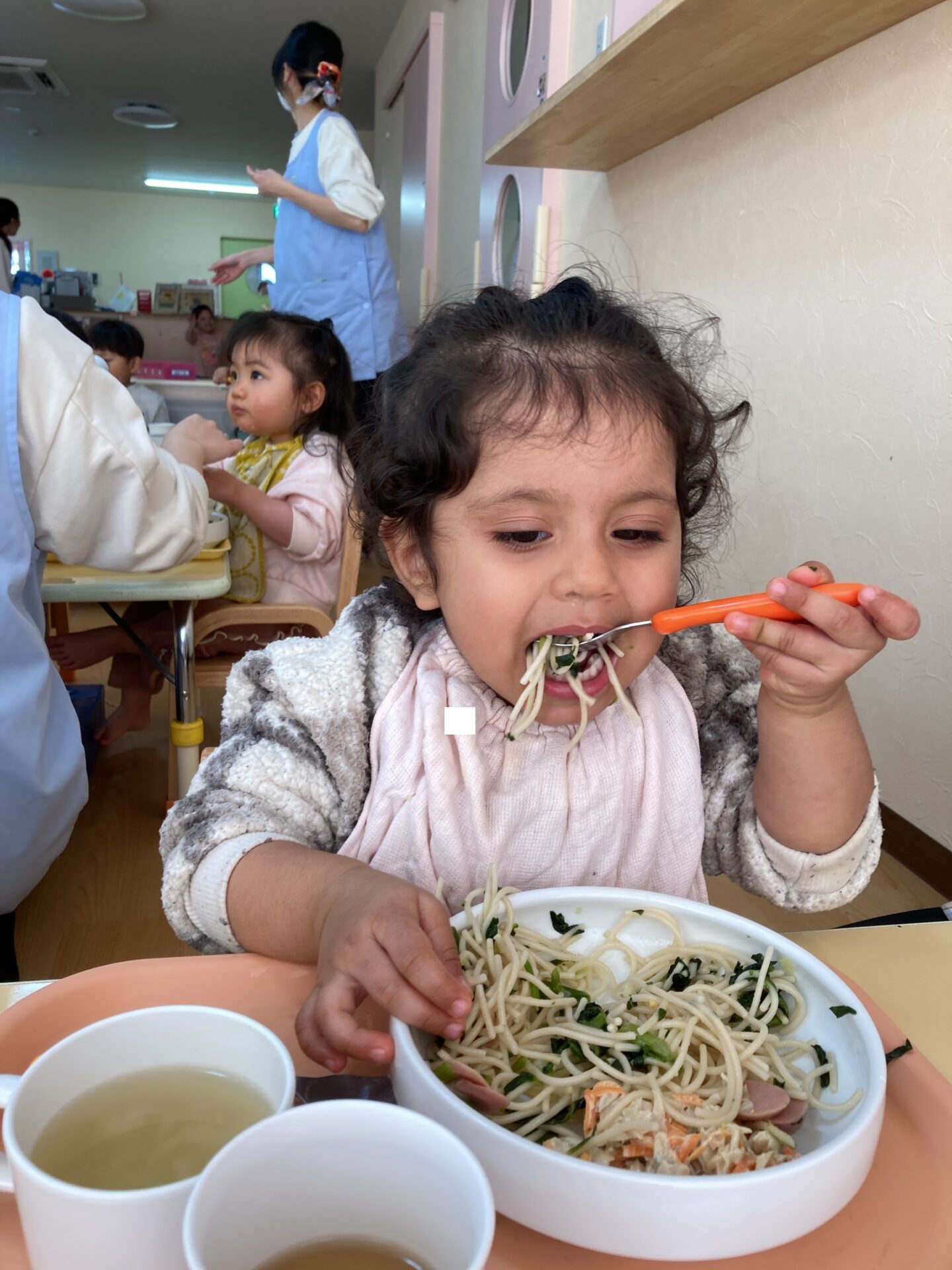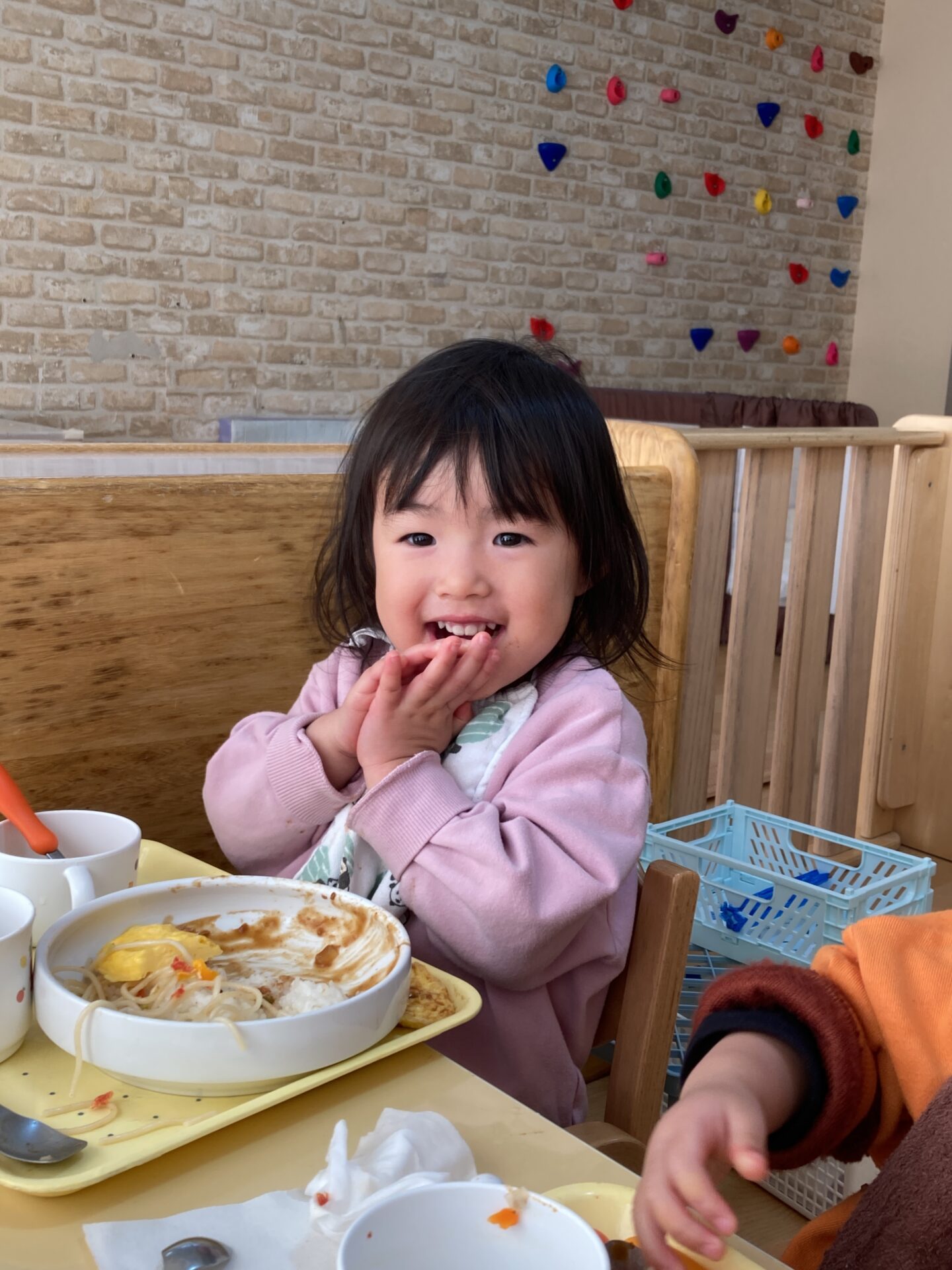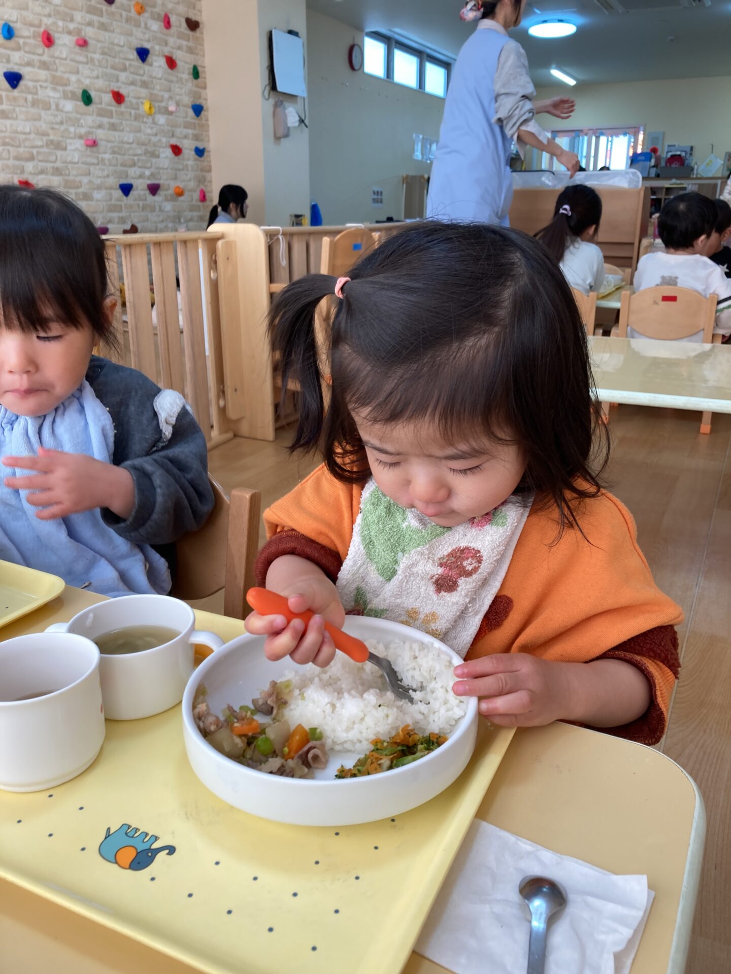 手づかみで豪快に食べていたのが、今ではスプーンやフォークを上手に使って食べる事ができるようになりました!