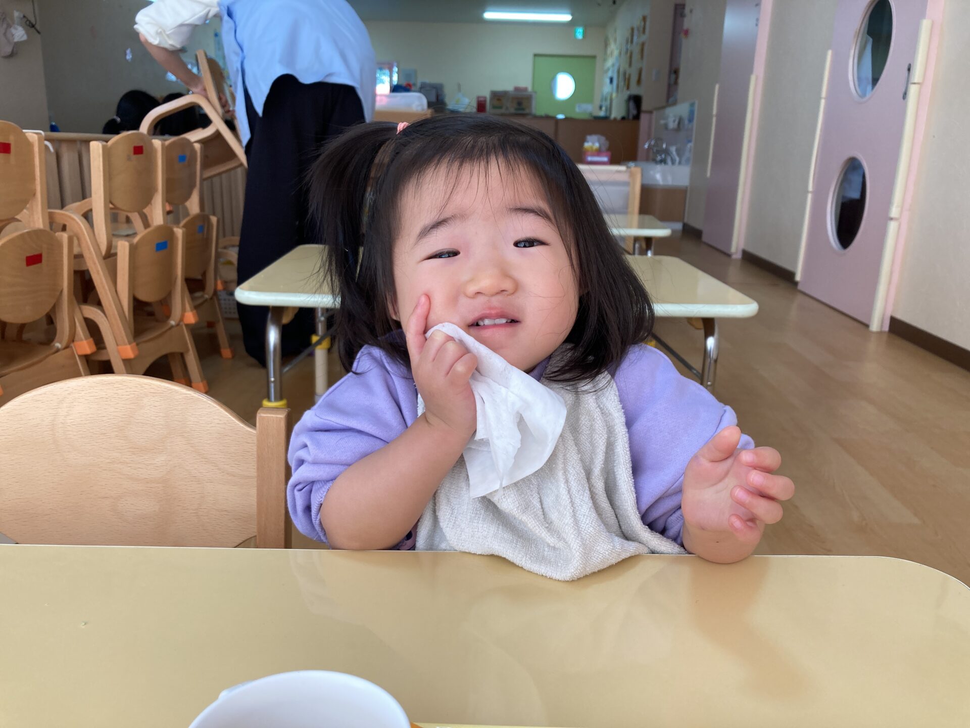 こぼしてしまう量も減ってきて、食べ終わったエプロンを見ながら「上手に食べた!」と誇らしげなお友だちもいます。