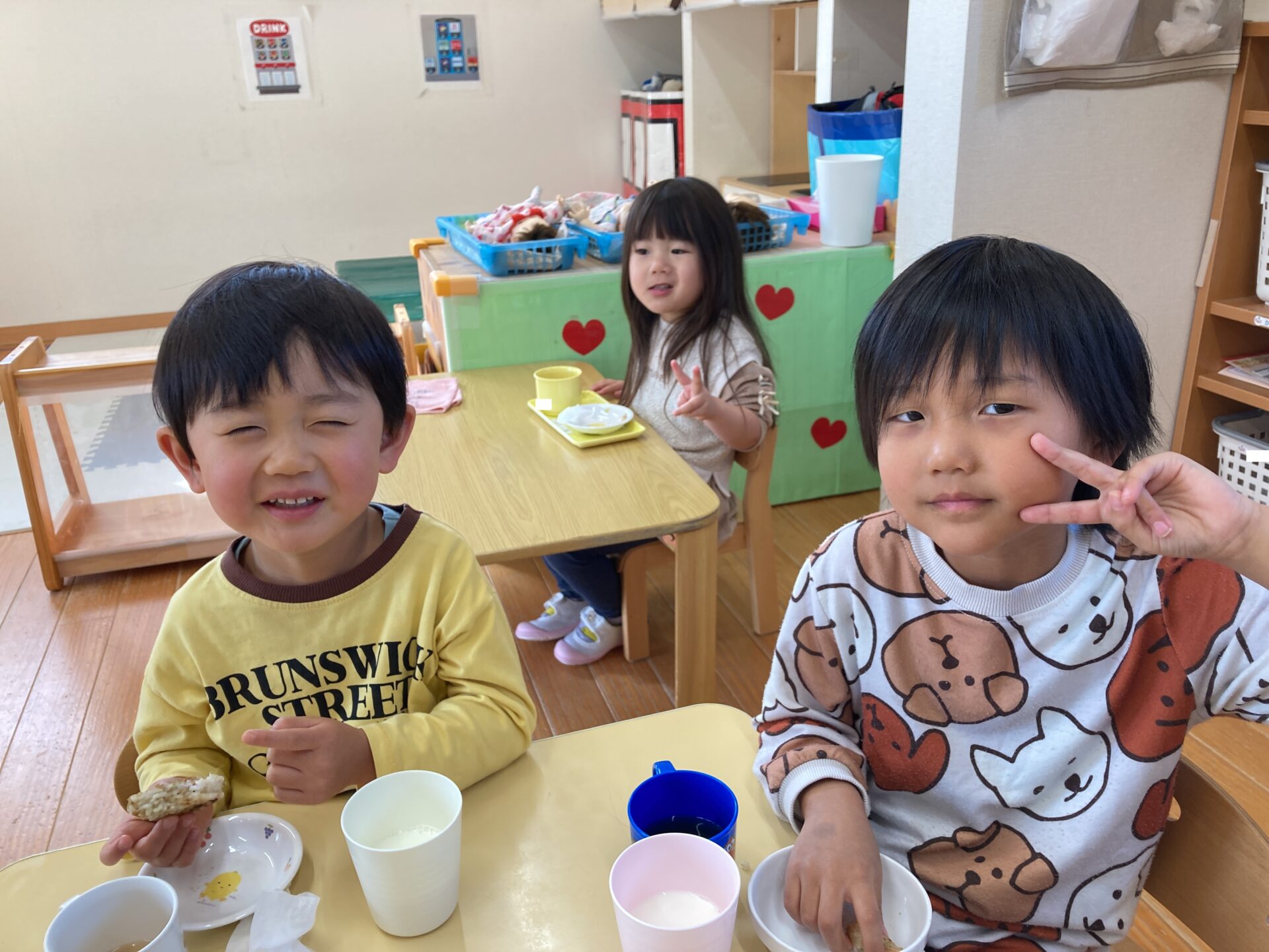 「おいしいね」「牛乳一緒に飲もうか」と会話を楽しみながら食べる様子がありました