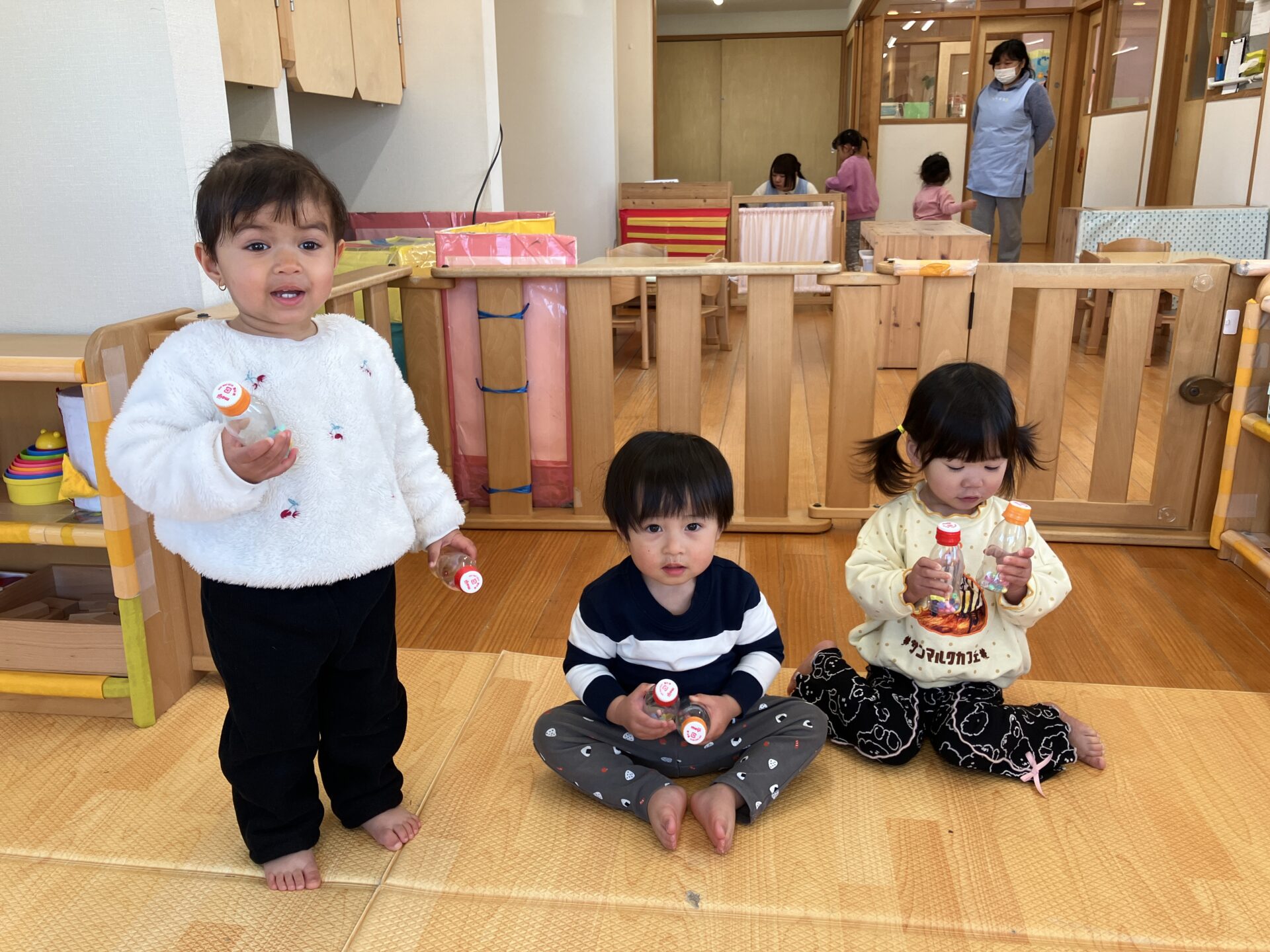 乳児クラスのみんなももらったおもちゃに目を輝かせながら遊んでいました