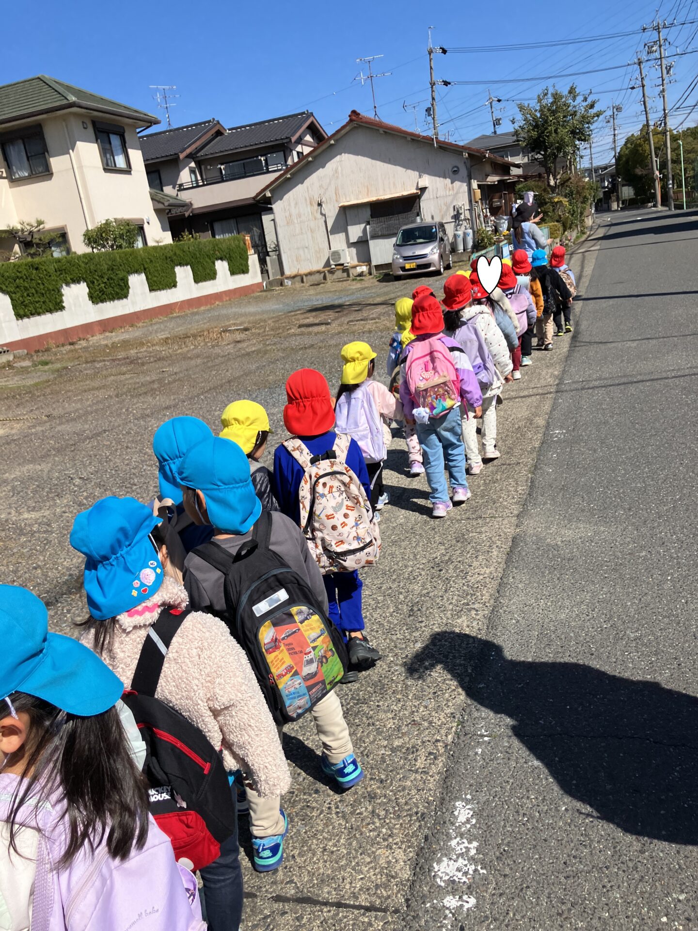 ゆめ組(3歳児)とつばさ組(5歳児)で手を繋いで出発です