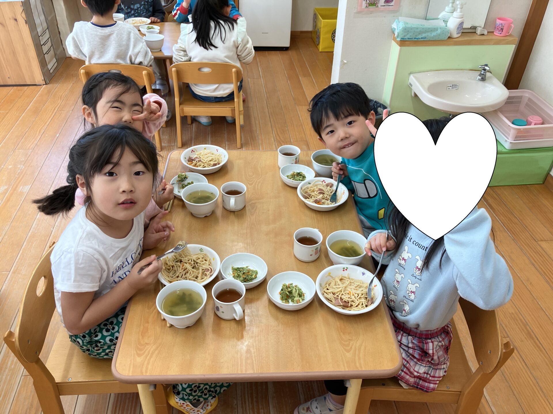 ゆめ組(3歳児)とつばさ組(5歳児)で、初めて一緒に給食を食べました