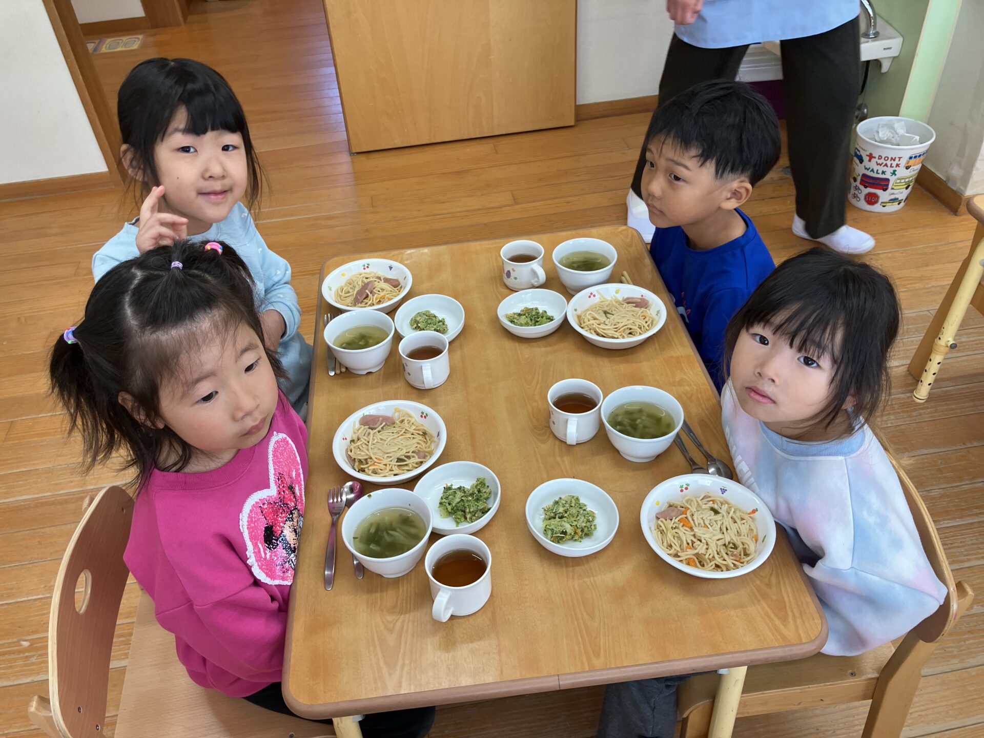 普段と違う環境に緊張した様子の子どもたちでしたが、段々と楽しそうな笑い声が聞こえる給食となりました!
