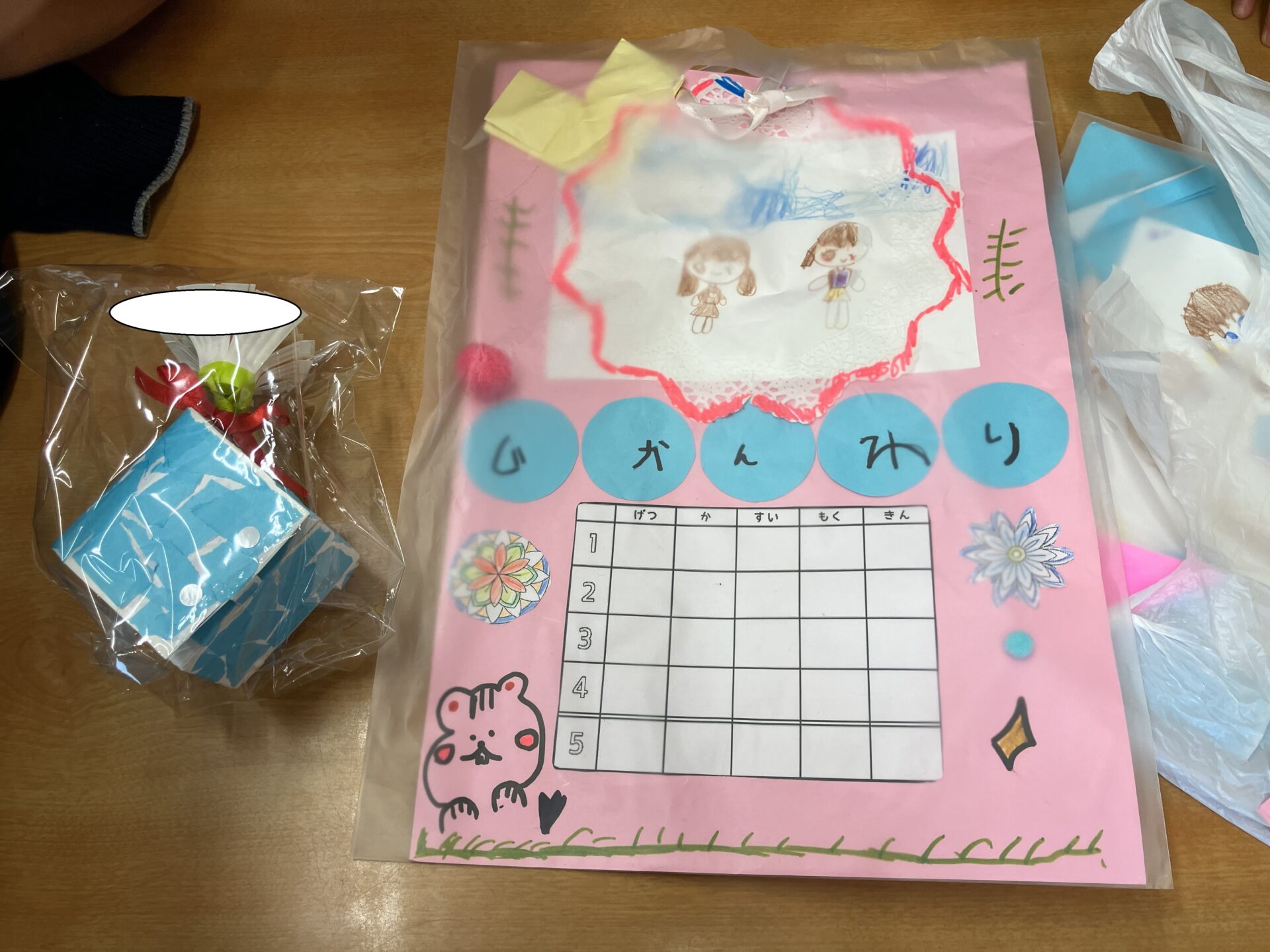 ゆめ組からは、つばさ組が小学校で使うランドセル色の小物入れ