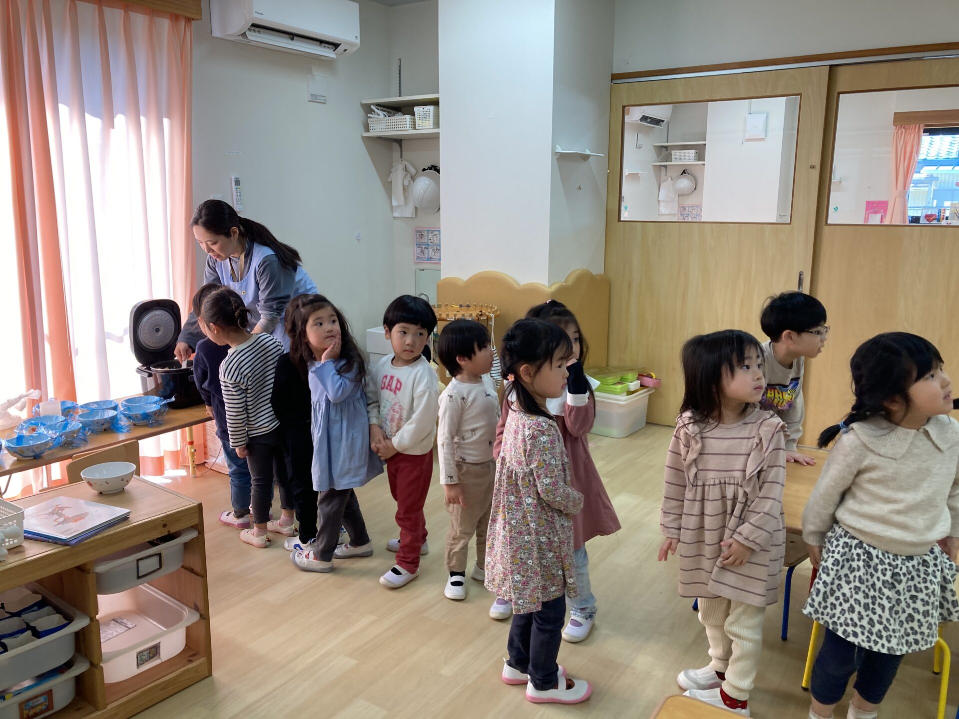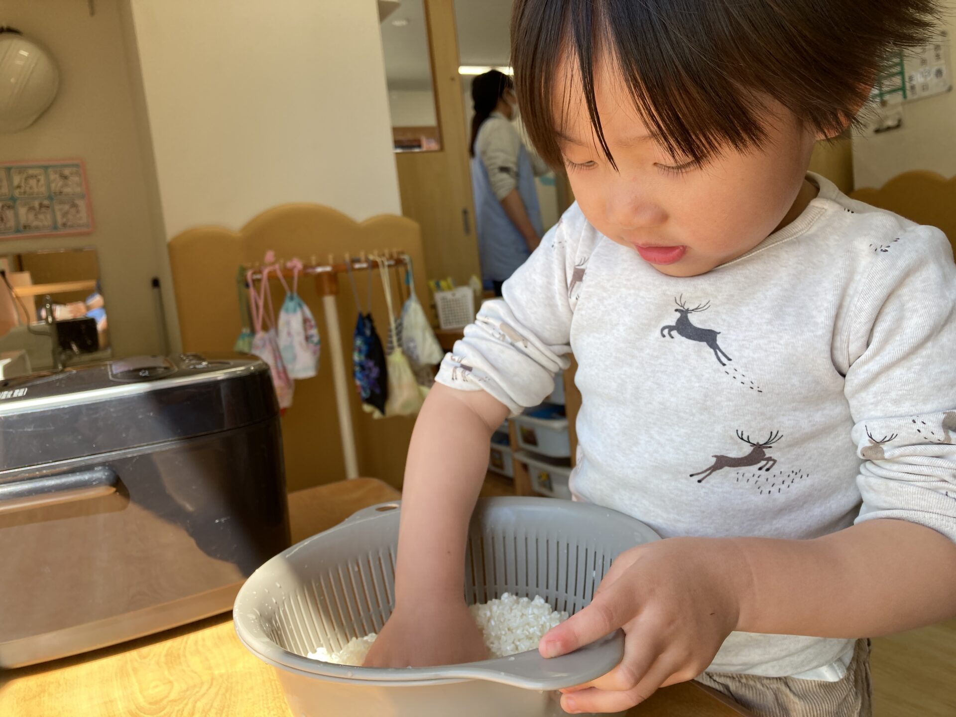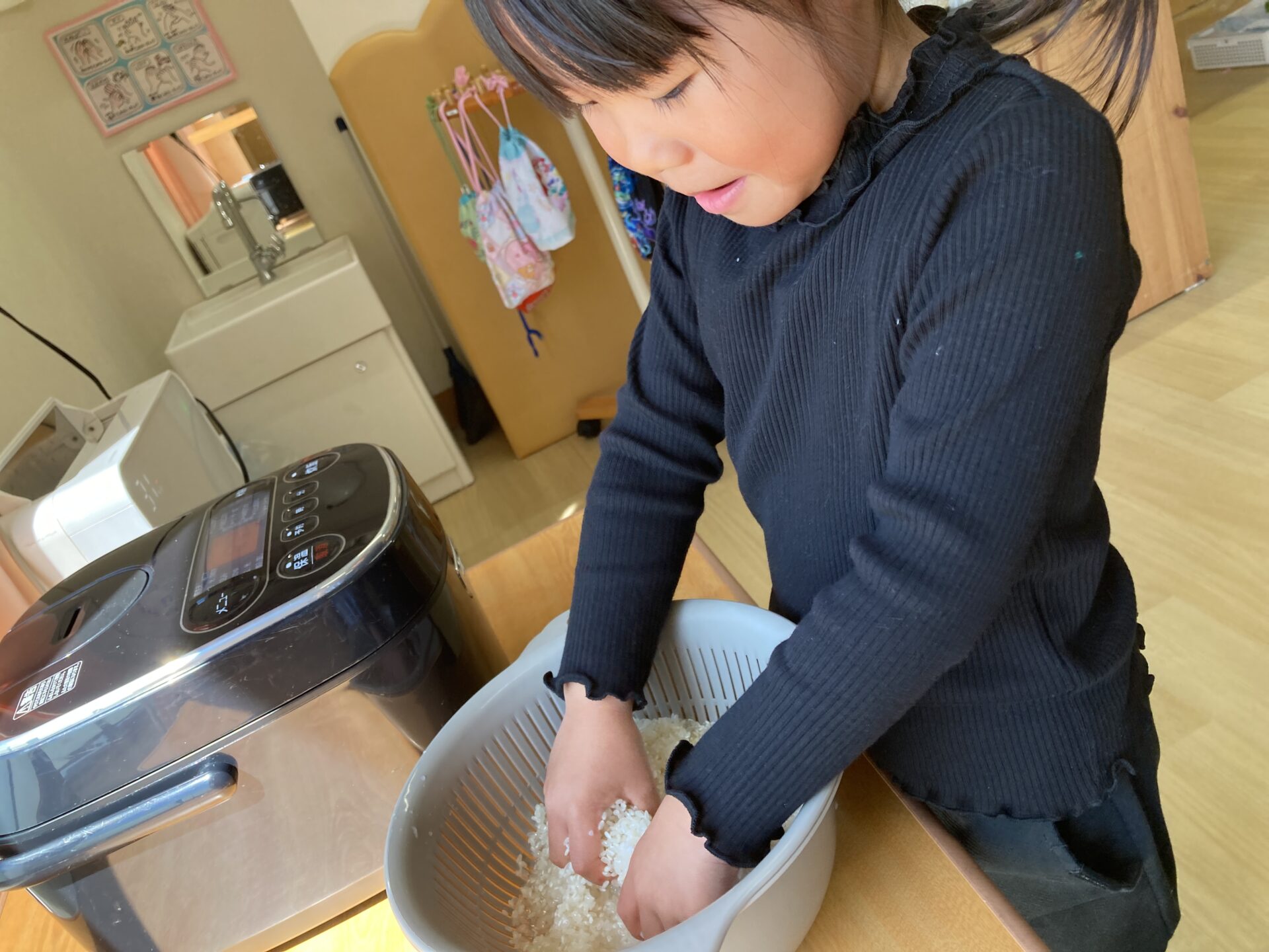 ひまわり組が毎朝炊飯している姿を見ているので、密かに「自分たちもやりたい」と思っていた子どもたち。