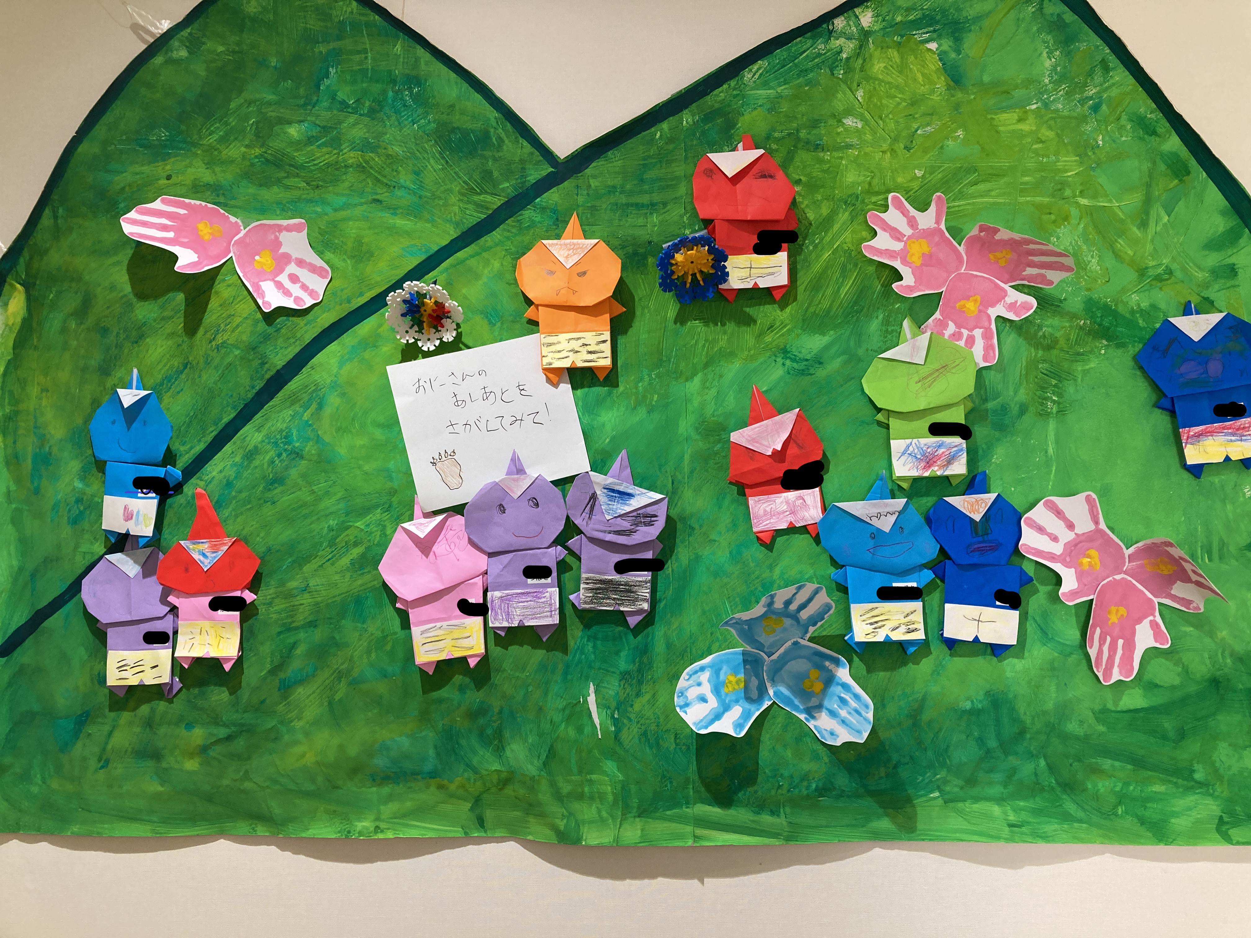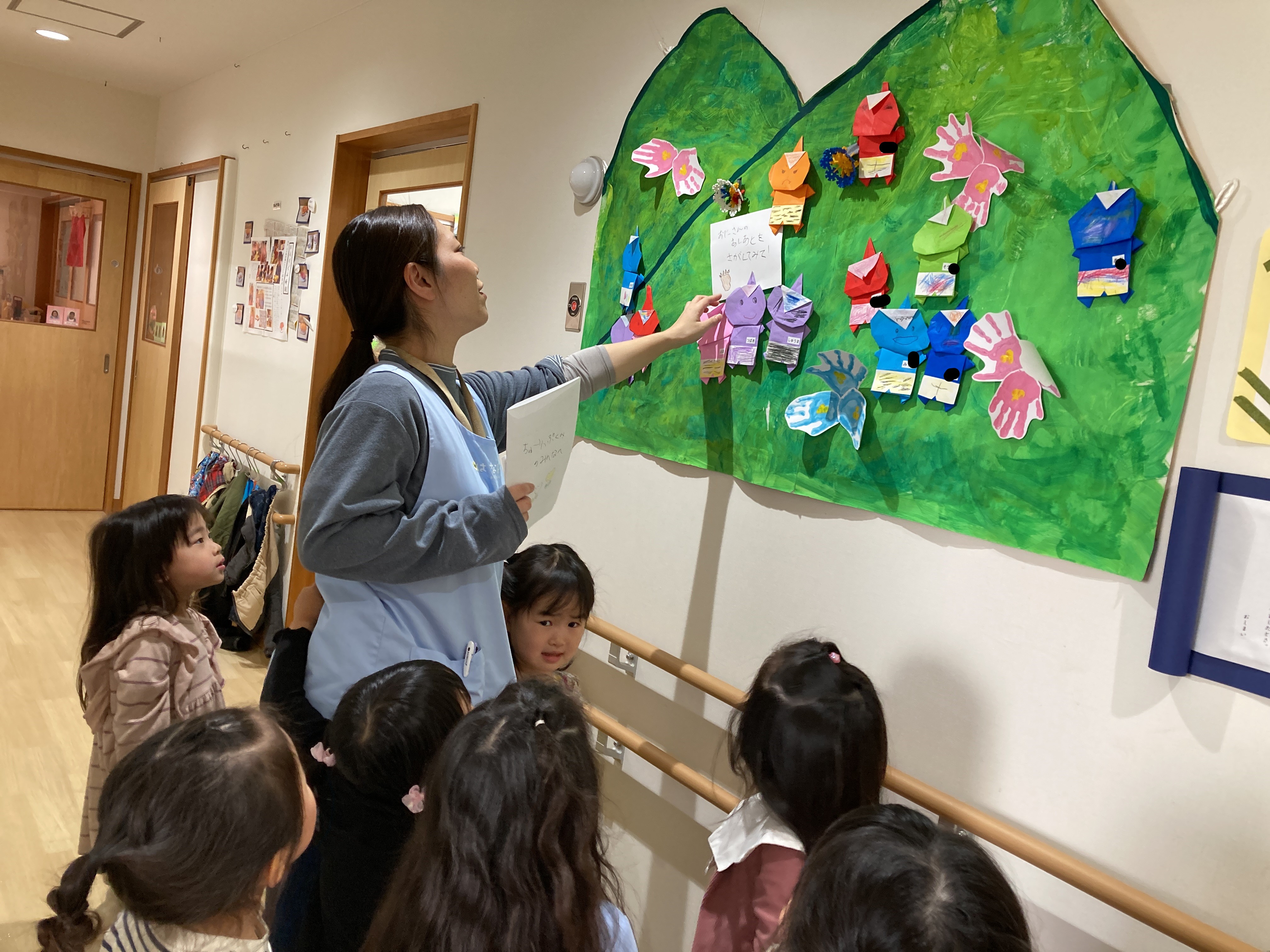 「山の絵が描いてあるよ」「おにはどこから来たの?だって」「山だよ!」「でも保育園に山なんかあった?」「廊下に貼ってあるじゃん!」「鬼もいるね」と名探偵がたくさん![]()