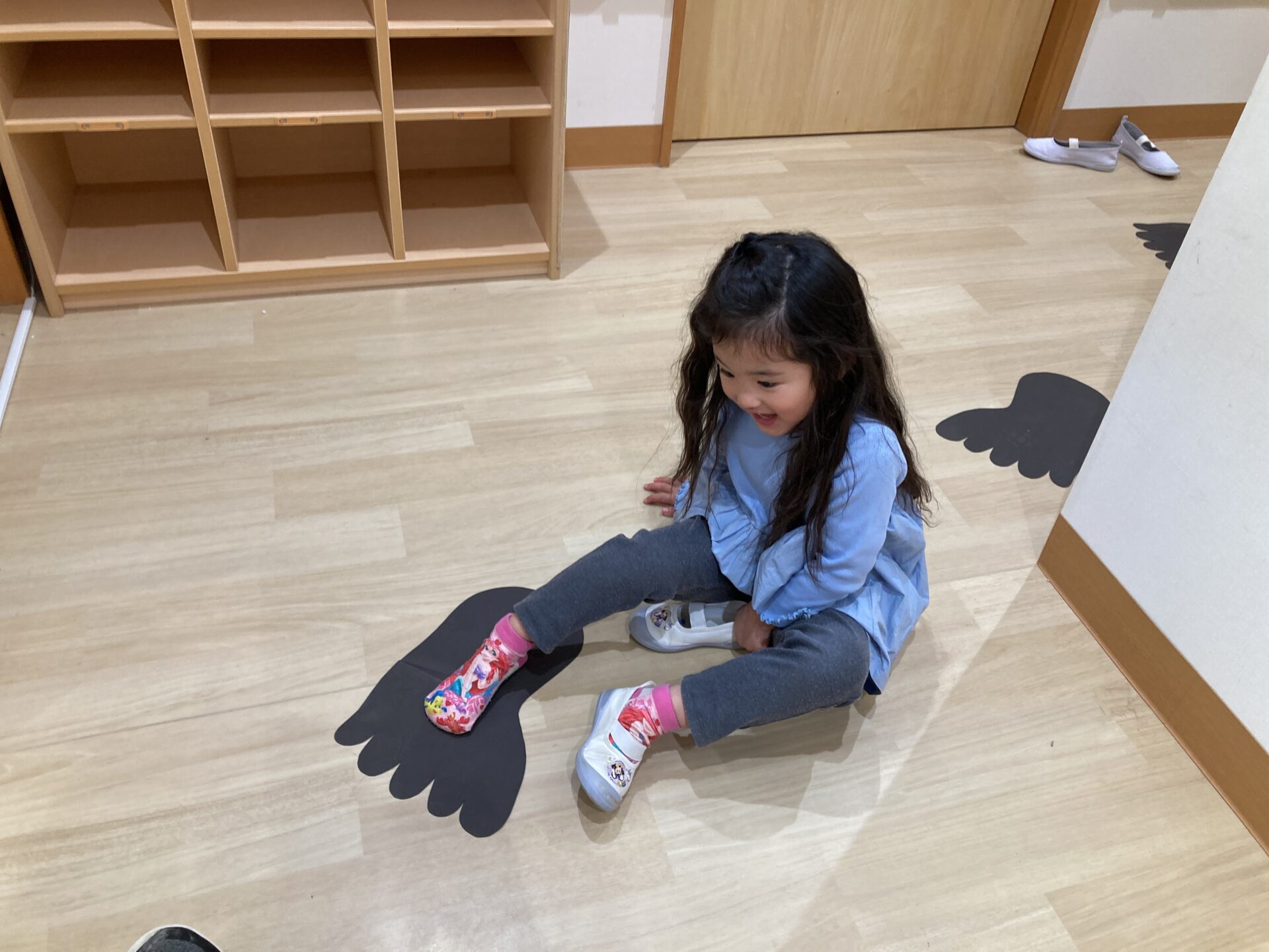 「もしかしておにも来てるのかな?」という想像をして、数人不安そうな表情を浮かべましたが、保育士にくっつきながらも足跡探しを頑張ります。