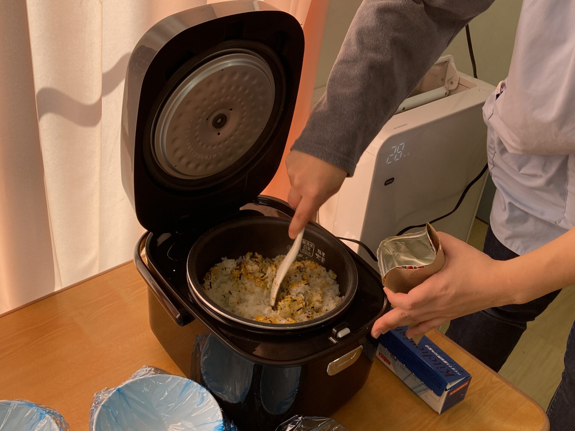 ちょうどお米も炊けたので、そのまま部屋に戻っておにぎり作りを開始しました🍙