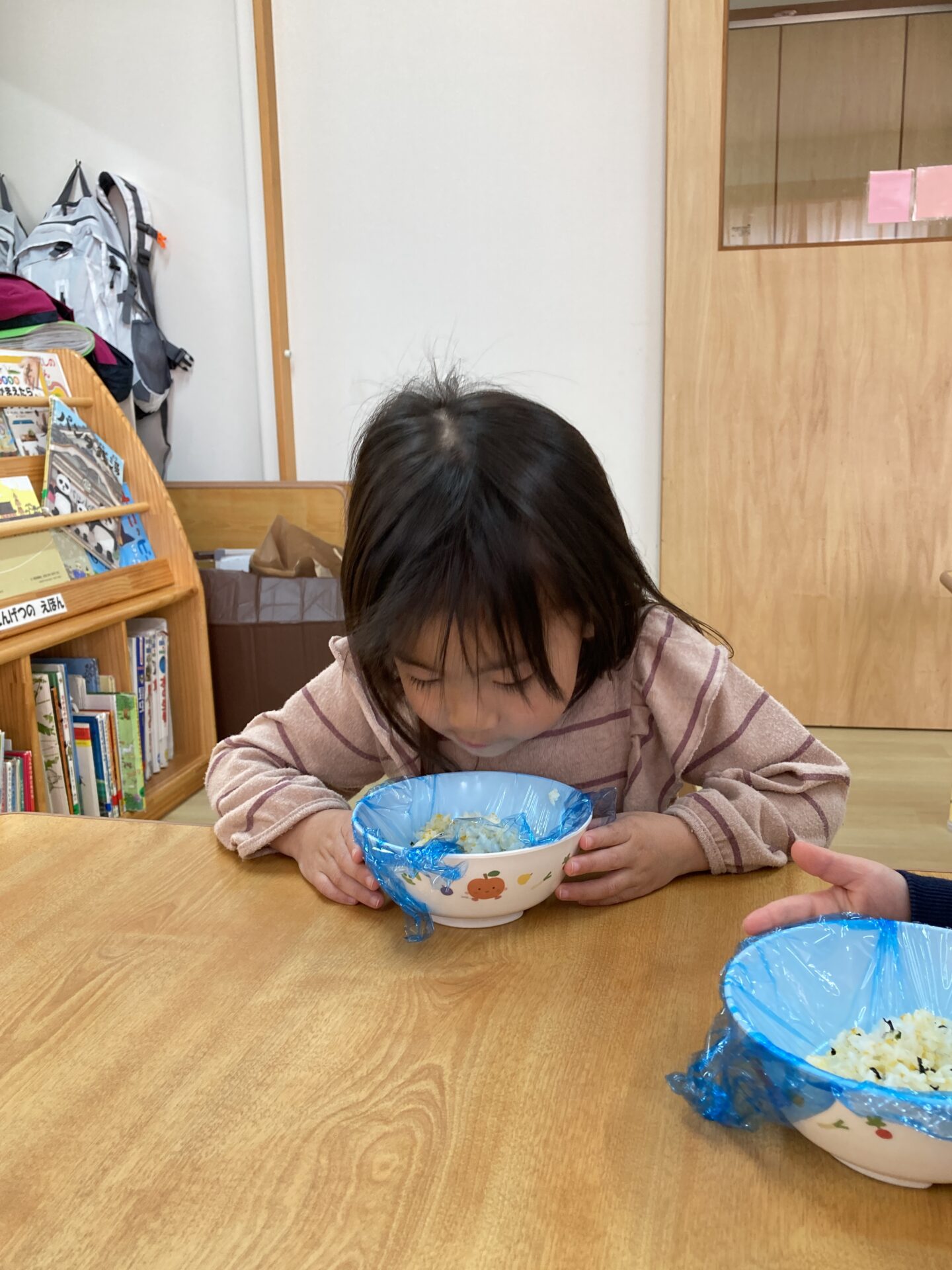 手に入れたふりかけを混ぜ込んで、一人ずつお皿に食べる分をよそってもらいます。