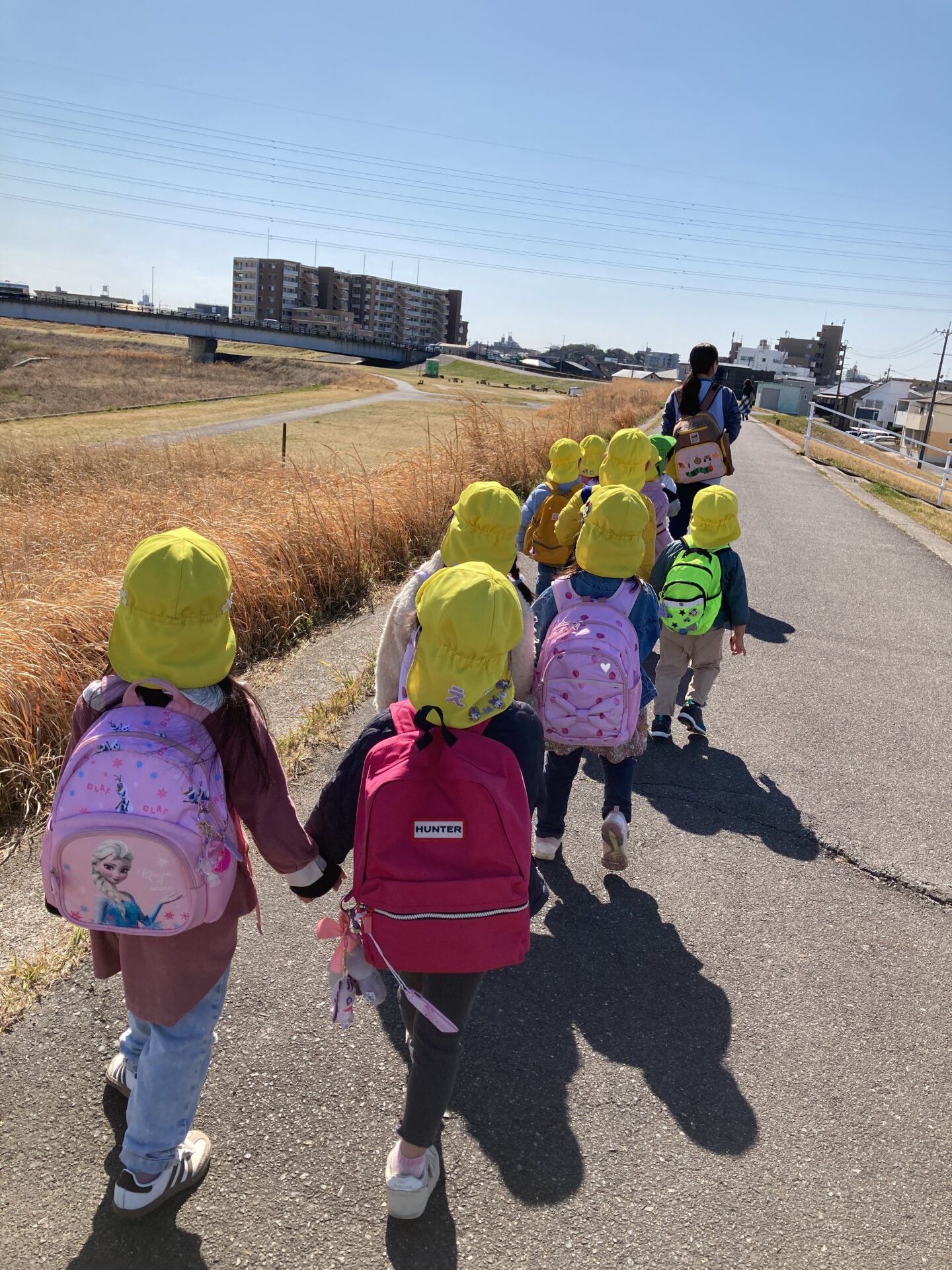 天白川の土手に向かっている最中、すでにいつもよりテンション高めの子どもたち。