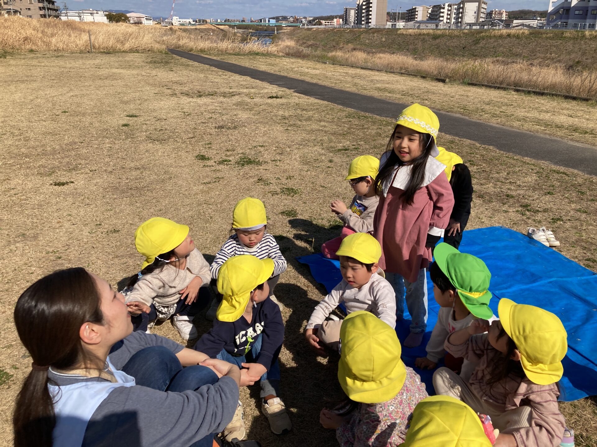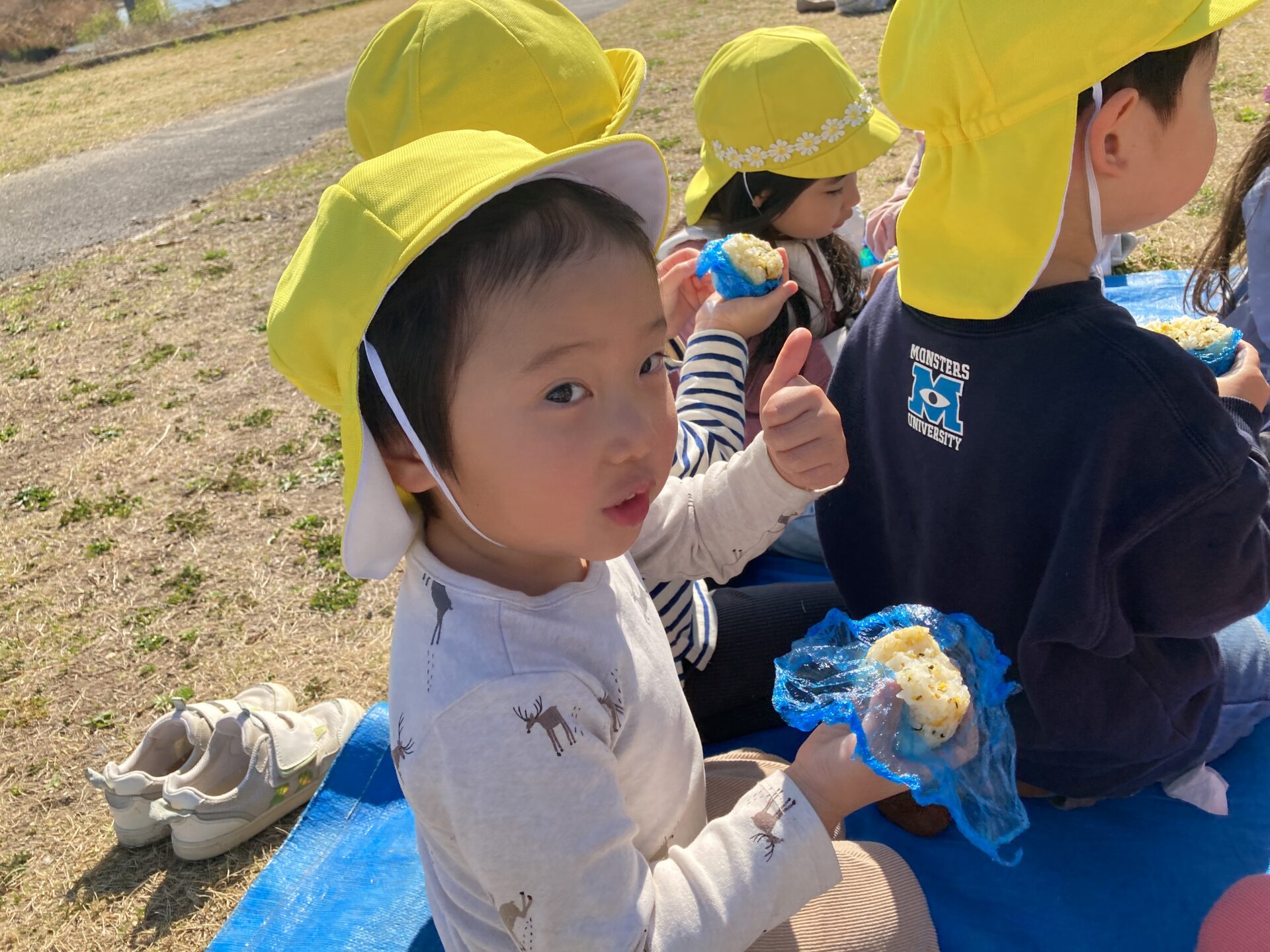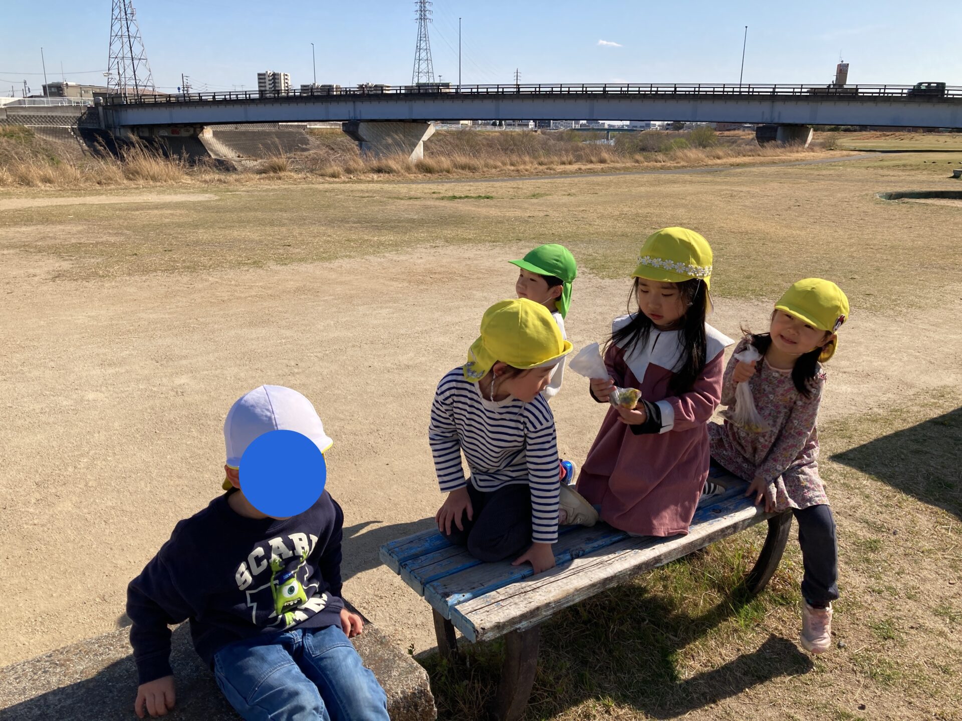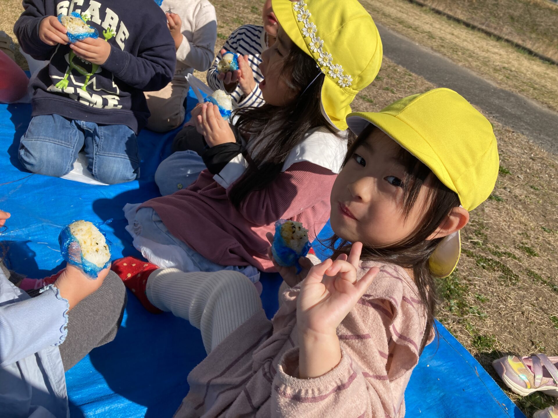 おやつの時間、みんなはおにぎりを持って天白川の土手に行きました。