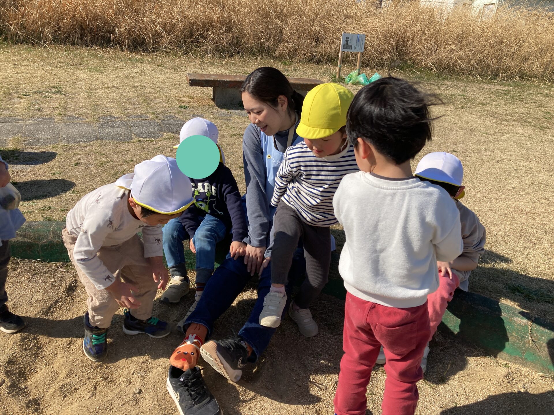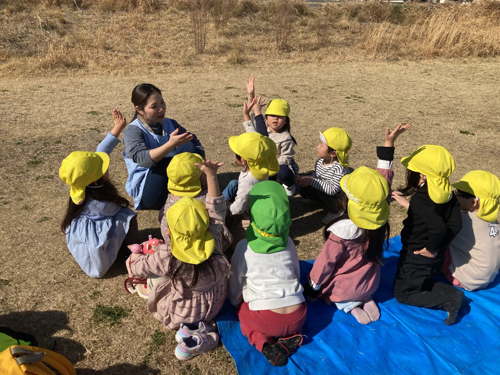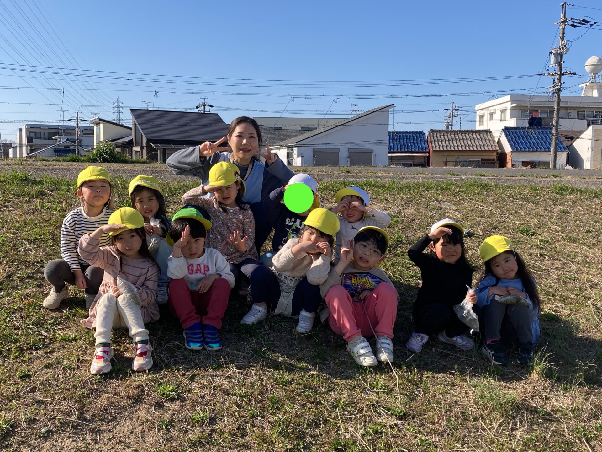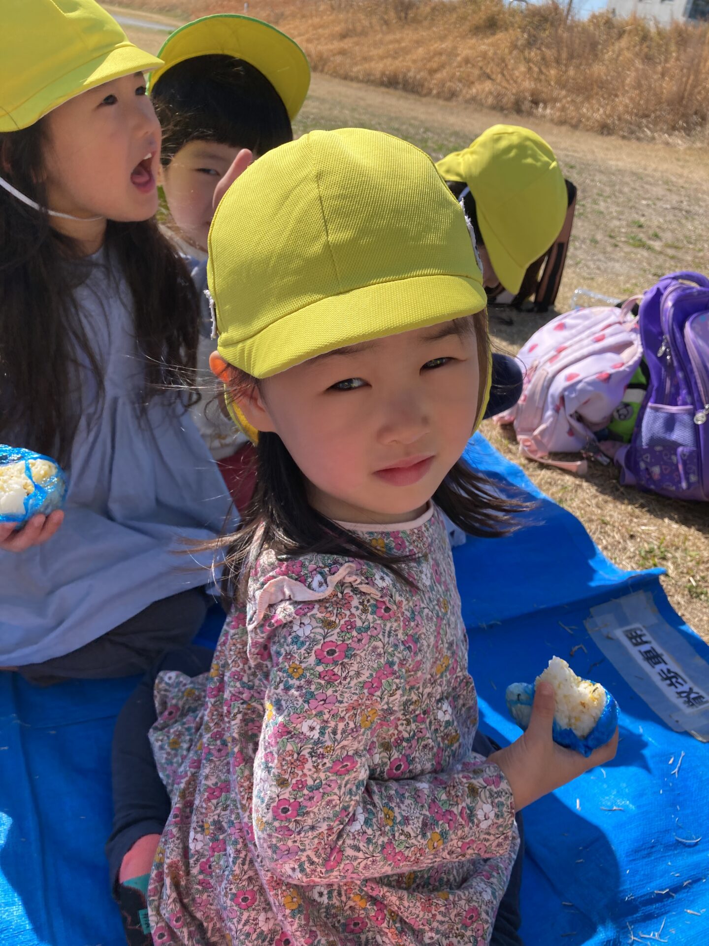 おやつの時間、みんなはおにぎりを持って天白川の土手に行きました。