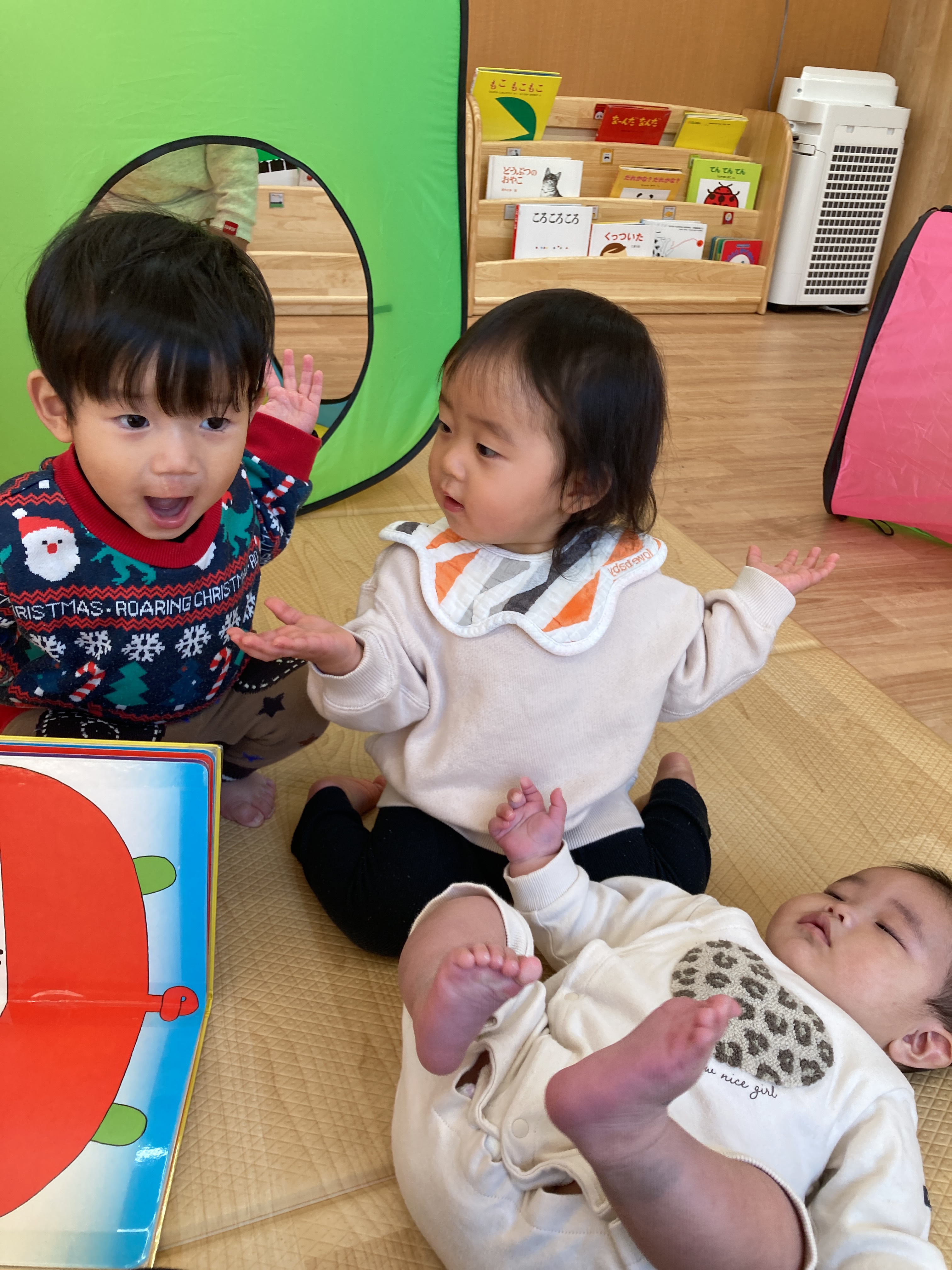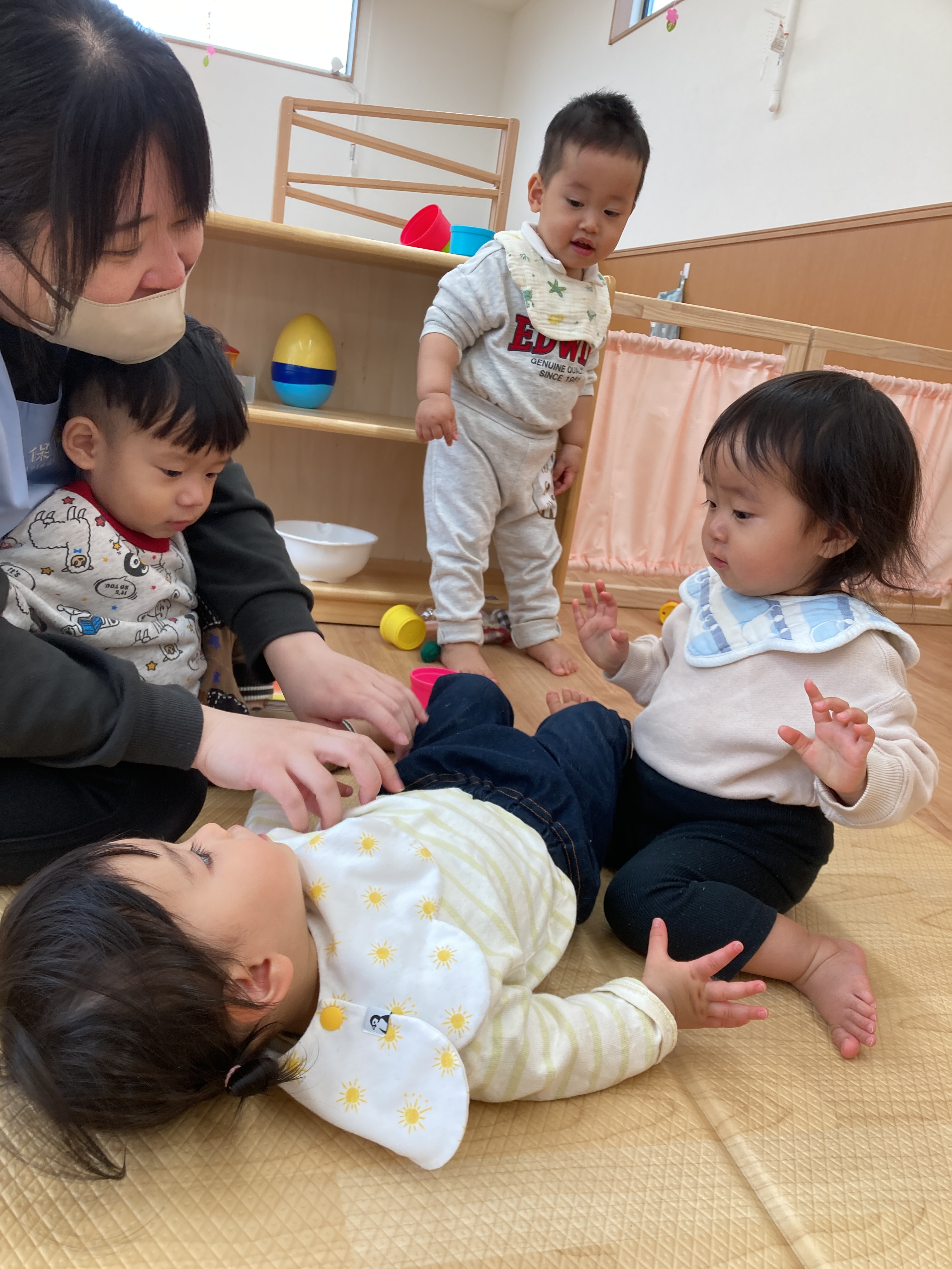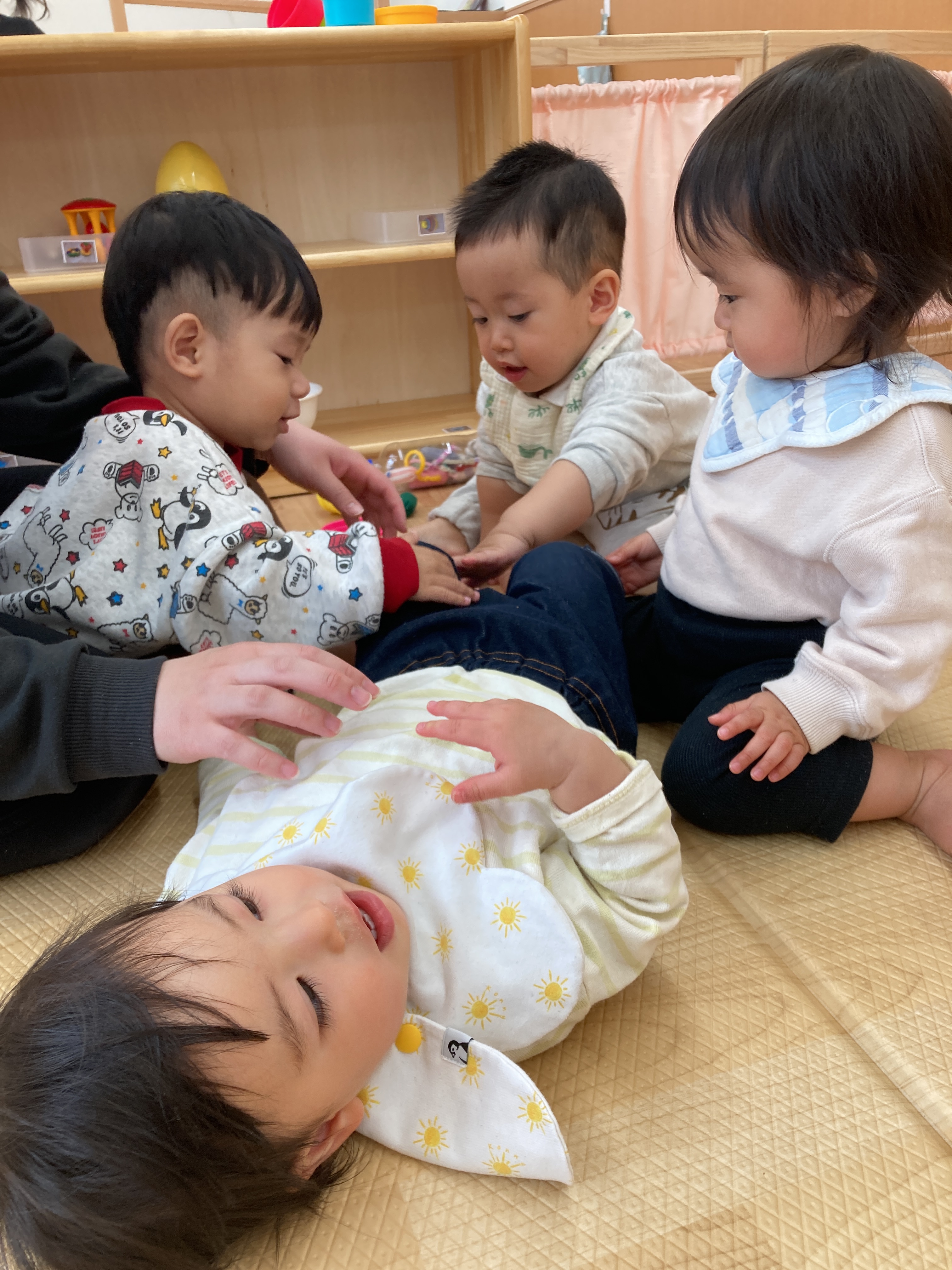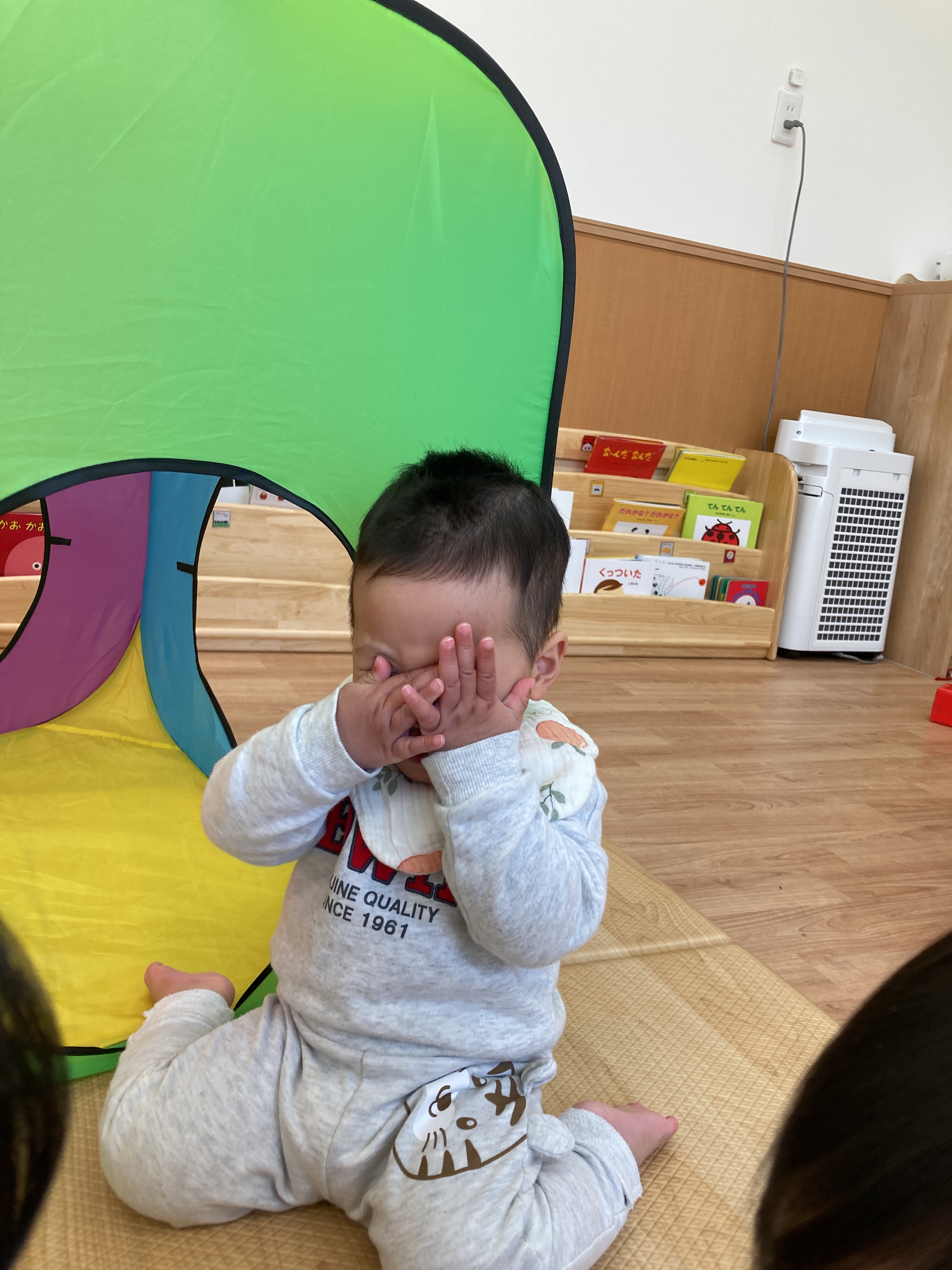 その場面を見ていたお友達も一緒にしてくれるようになり、最終的には三人のお友達が代わる代わる「いないいないばあっ!」をしてくれていましたよ![]()