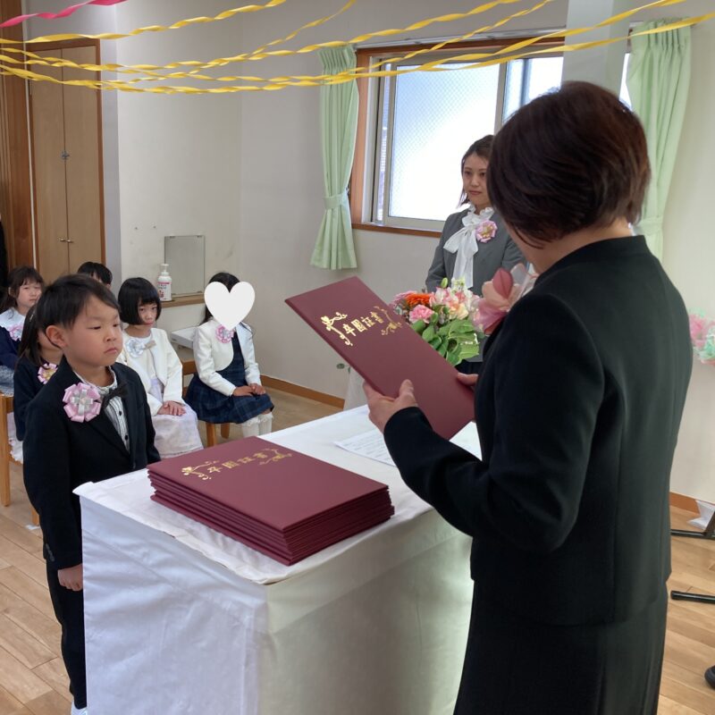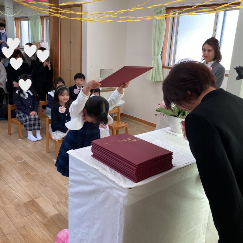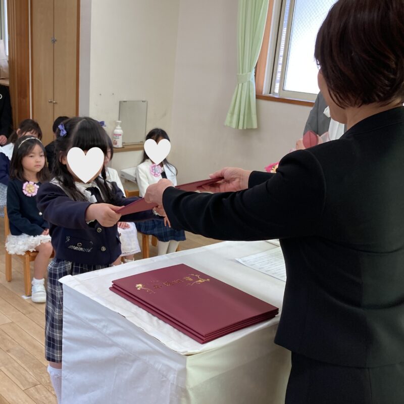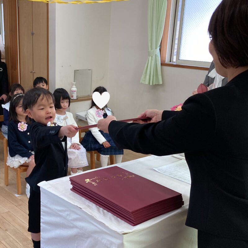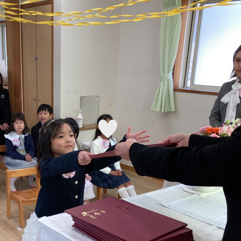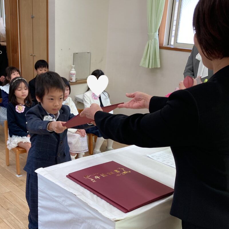 担任の先生から一人ひとり名前を呼ばれ、「はい!」と元気よく返事をして卒園証書を受け取る姿に、大きな成長を感じました