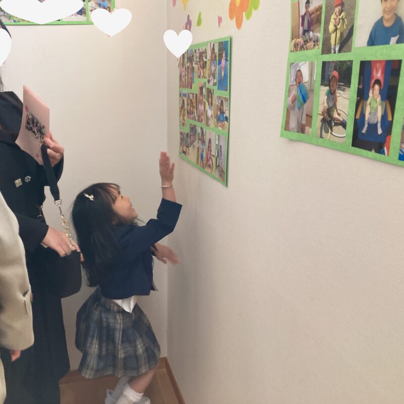 階段に貼ってある入園当初から今までの写真を見て大喜びな子どもたち