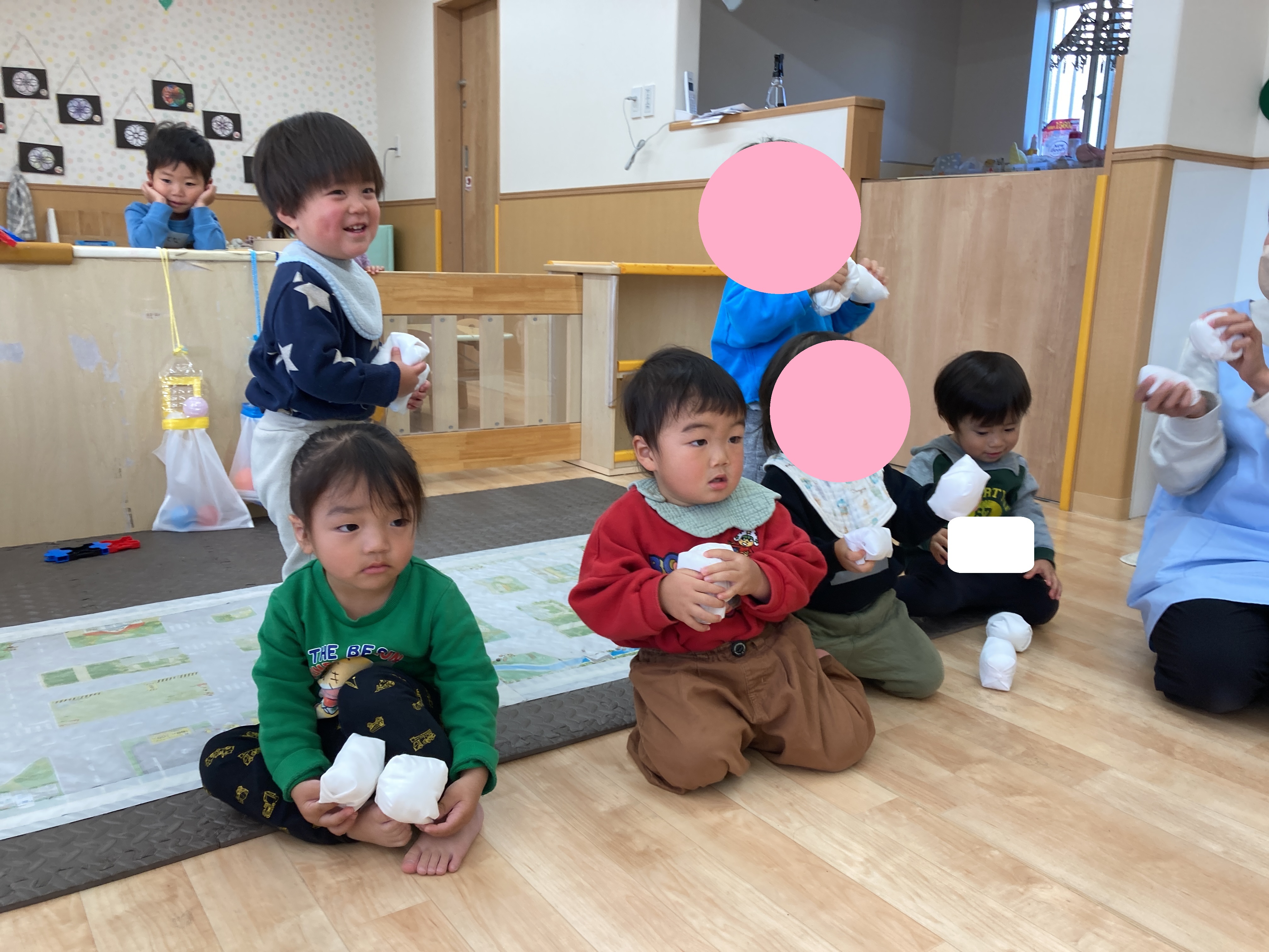 こちらのお友だちはお手玉を頬に当てて、感触を楽しむ姿が見られました![]()