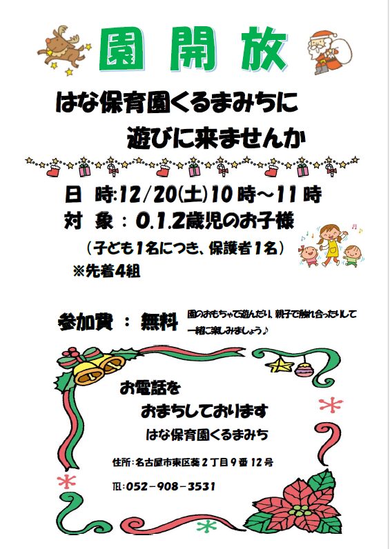 12月20日(土)に園開放をおこないます。ぜひ、親子で遊びにきませんか?